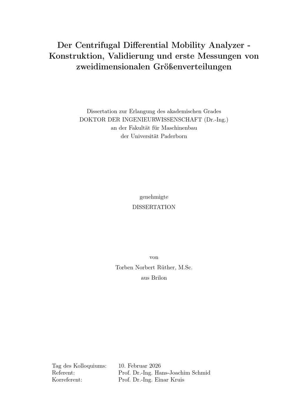Der Centrifugal Differential Mobility Analyzer : Konstruktion, Validierung und erste Messungen von zweidimensionalen Größenverteilungen / von Torben Norbert Rüther ; Referent: Prof. Dr.-Ing. Hans-Joachim Schmid, Korreferent: Prof. Dr.-Ing. Einar Kruis