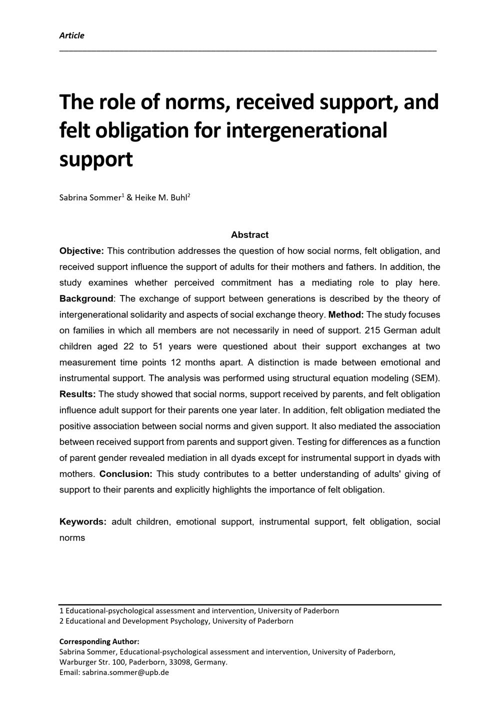 The role of norms, received support, and felt obligation for intergenerational support / Sabrina Sommer & Heike M. Buhl