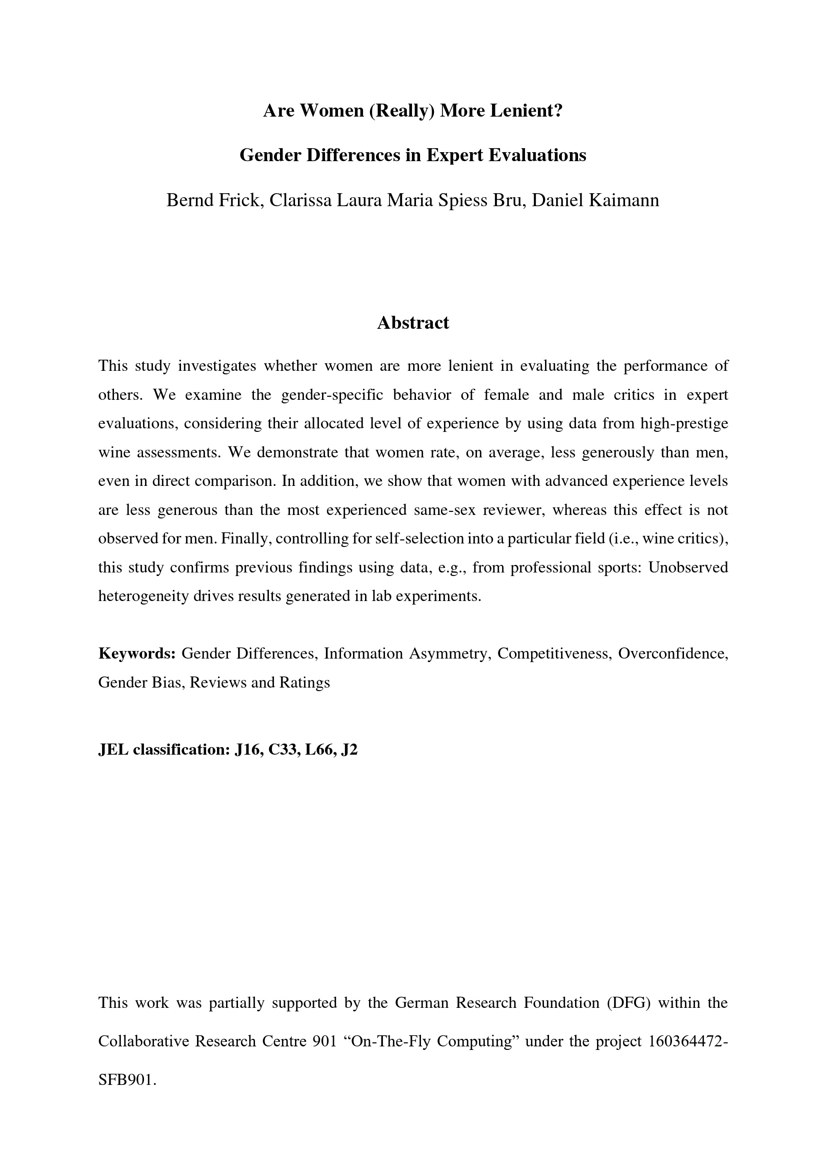 Are women (really) more lenient? : gender differences in expert evaluations / Bernd Frick, Clarissa Laura Maria Spiess Bru, Daniel Kaimann