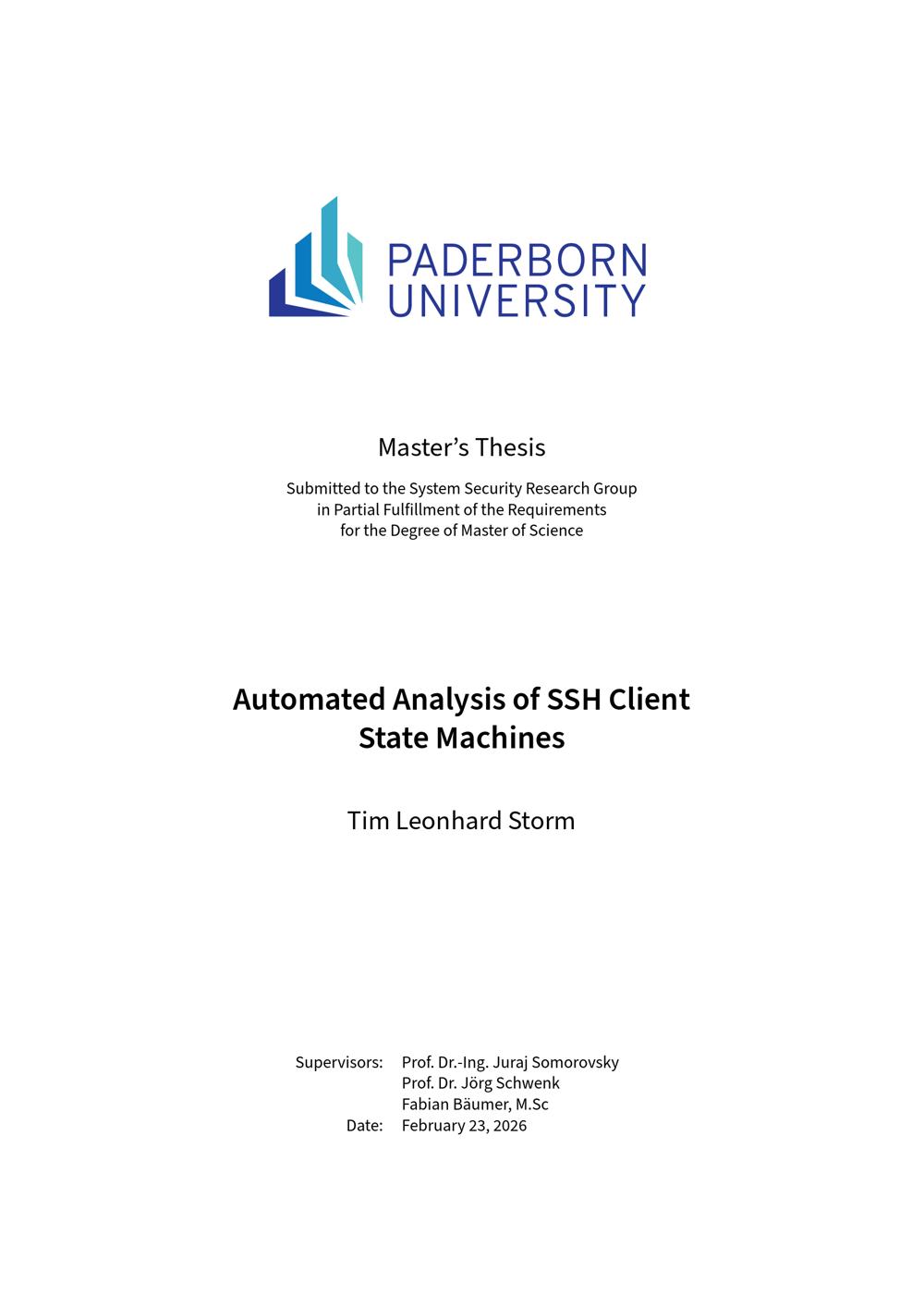 Automated analysis of SSH client state machines / Tim Leonhard Storm ; Supervisors: Prof. Dr.-Ing. Juraj Somorovsky, Prof. Dr. Jörg Schwenk, Fabian Bäumer, M.Sc