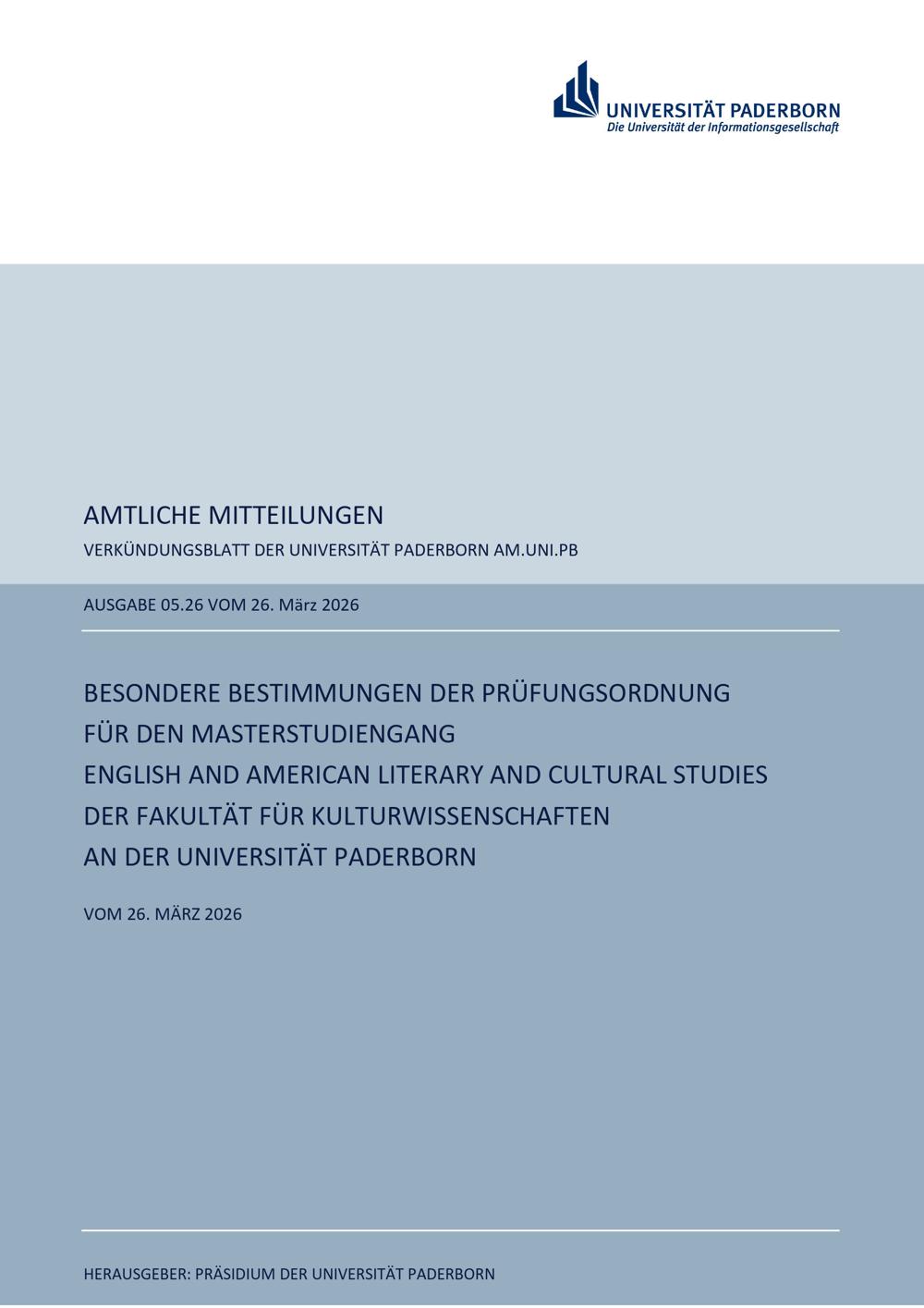 Besondere Bestimmungen der Prüfungsordnung für den Masterstudiengang English and American Literary and Cultural Studies der Fakultät für Kulturwissenschaften an der Universität Paderborn : vom 26. März 2026