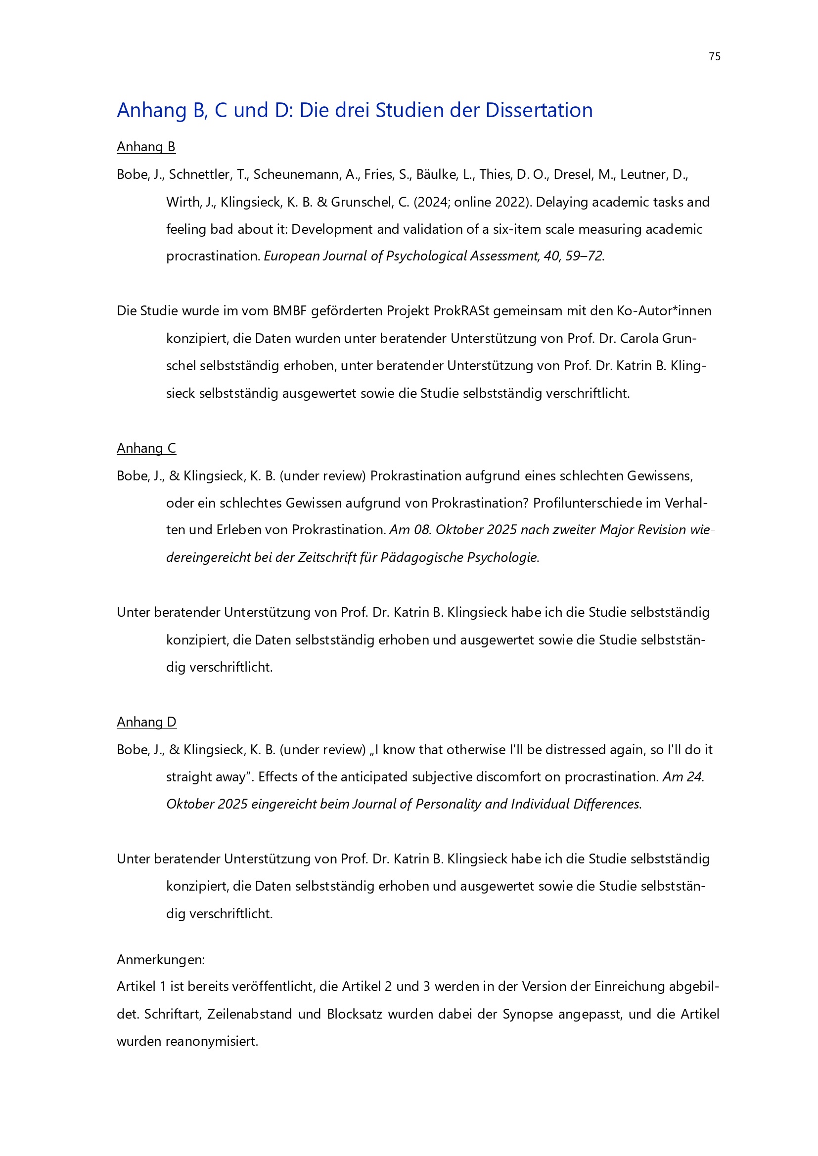 Anhang B, C und D: Die drei Studien der Dissertation