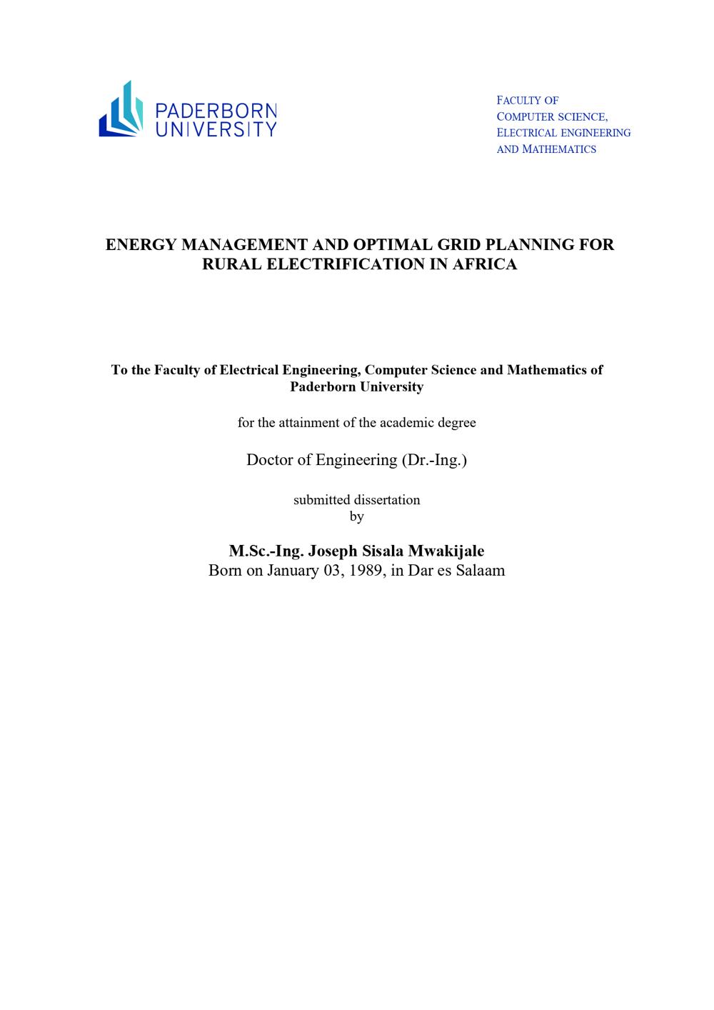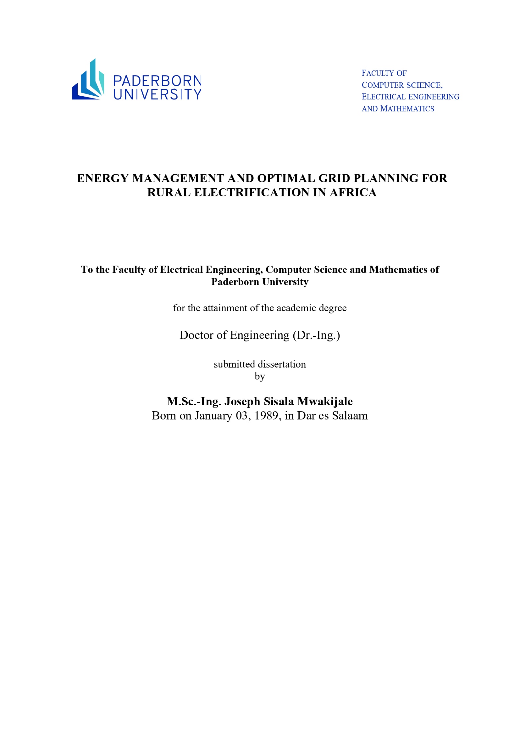 ENERGY MANAGEMENT AND OPTIMAL GRID PLANNING FOR RURAL ELECTRIFICATION IN AFRICA / Joseph Sisala Mwakijale ; First Reviewer: Prof. Dr.-Ing. Henning Meschede, Second Reviewer: Prof. Dr.-Ing. Stefen Krauter