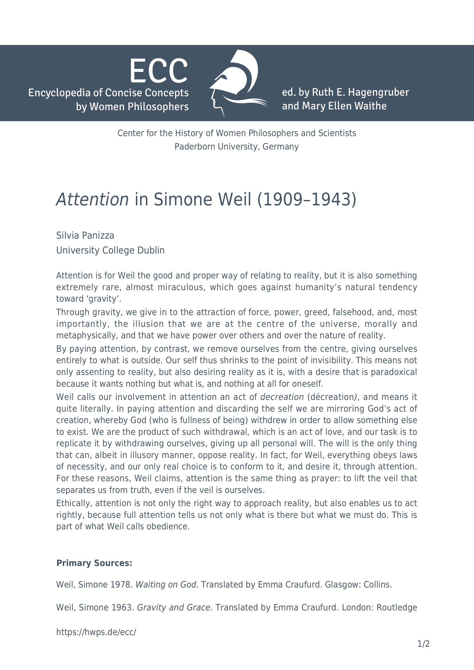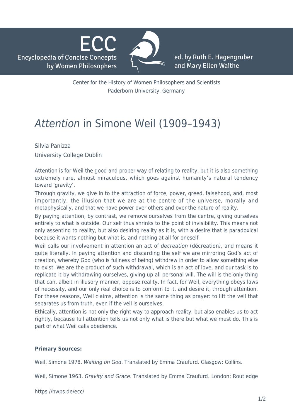 Attention in Simone Weil (1909-1943) / Silvia Panizza, University College Dublin