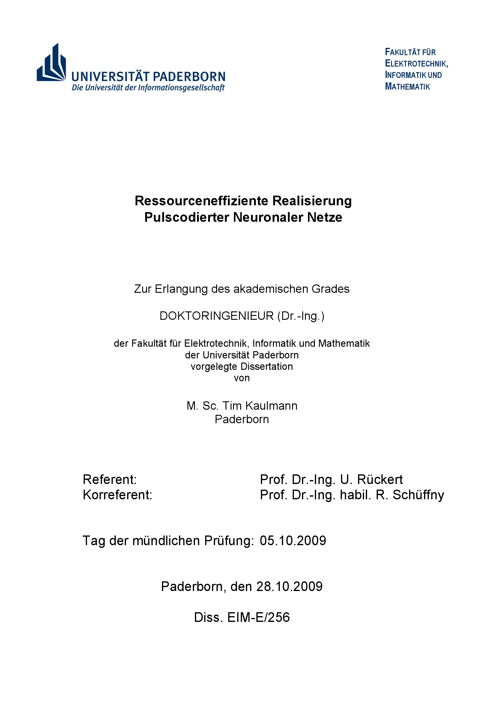 Ressourceneffiziente Realisierung pulscodierter neuronaler Netze / Tim Kaulmann