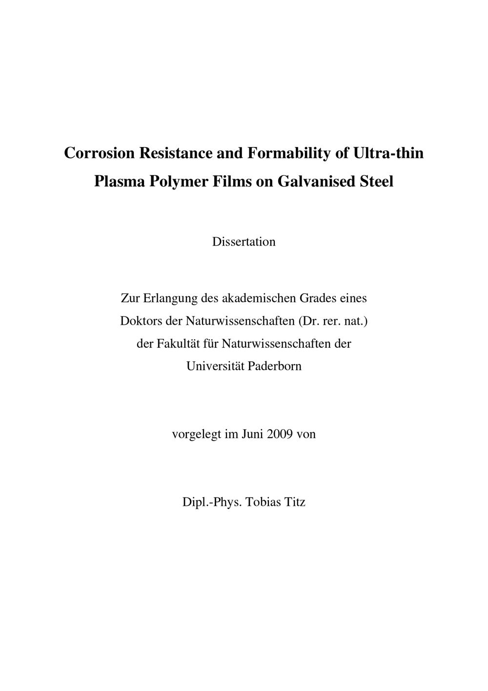 Corrosion resistance and formability of ultra-thin plasma polymer films on galvanised steel / Tobias Titz