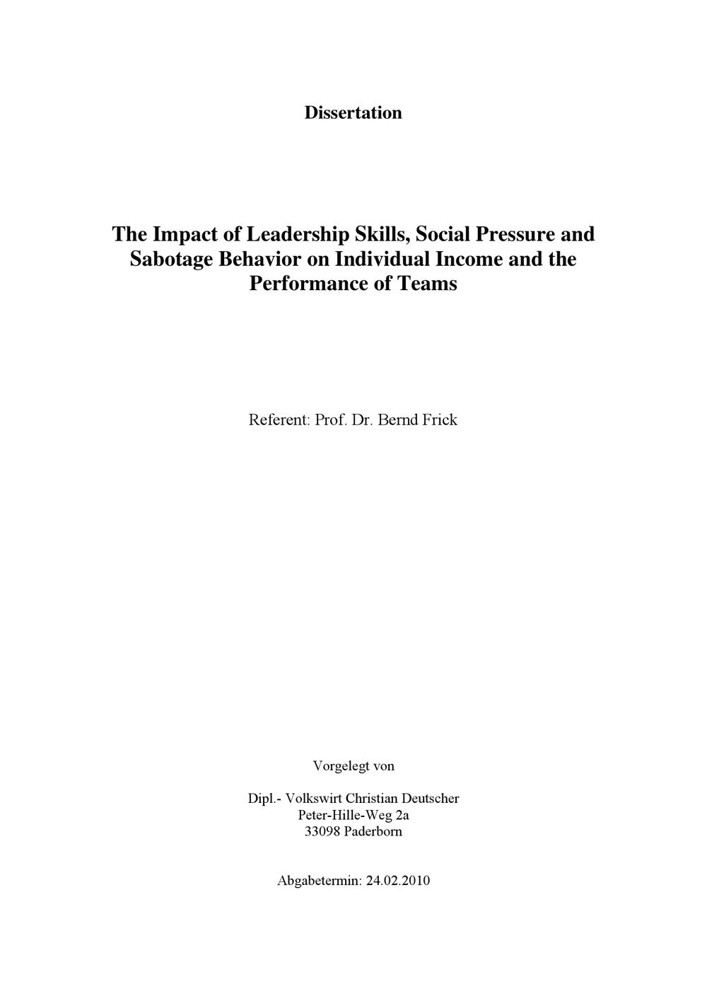 The impact of leadership skills, social pressure and sabotage behavior on individual income and the performance of teams / Christian Deutscher