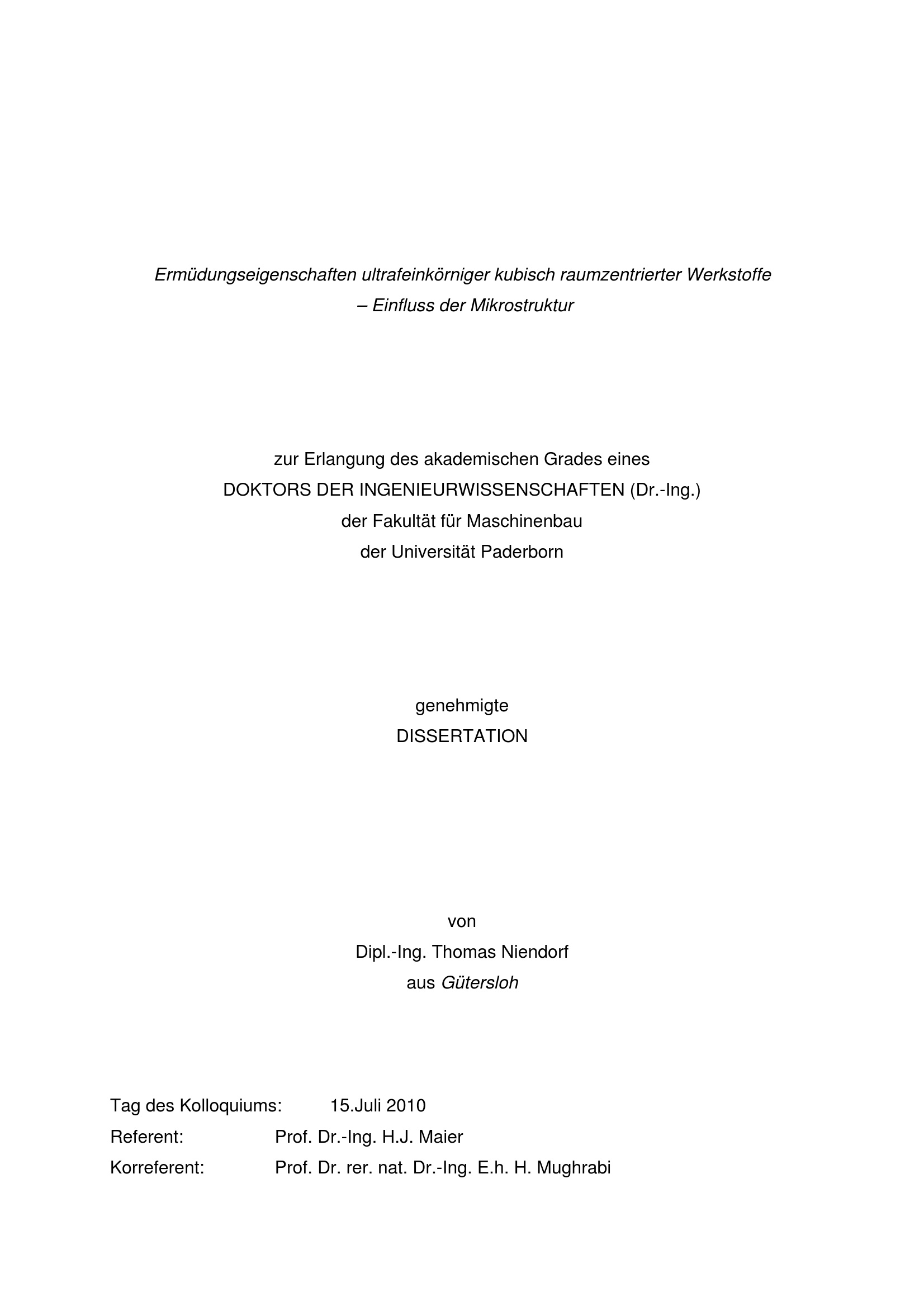 Ermüdungseigenschaften ultrafeinkörniger kubisch raumzentrierter Werkstoffe : Einfluss der Mikrostruktur / Thomas Niendorf