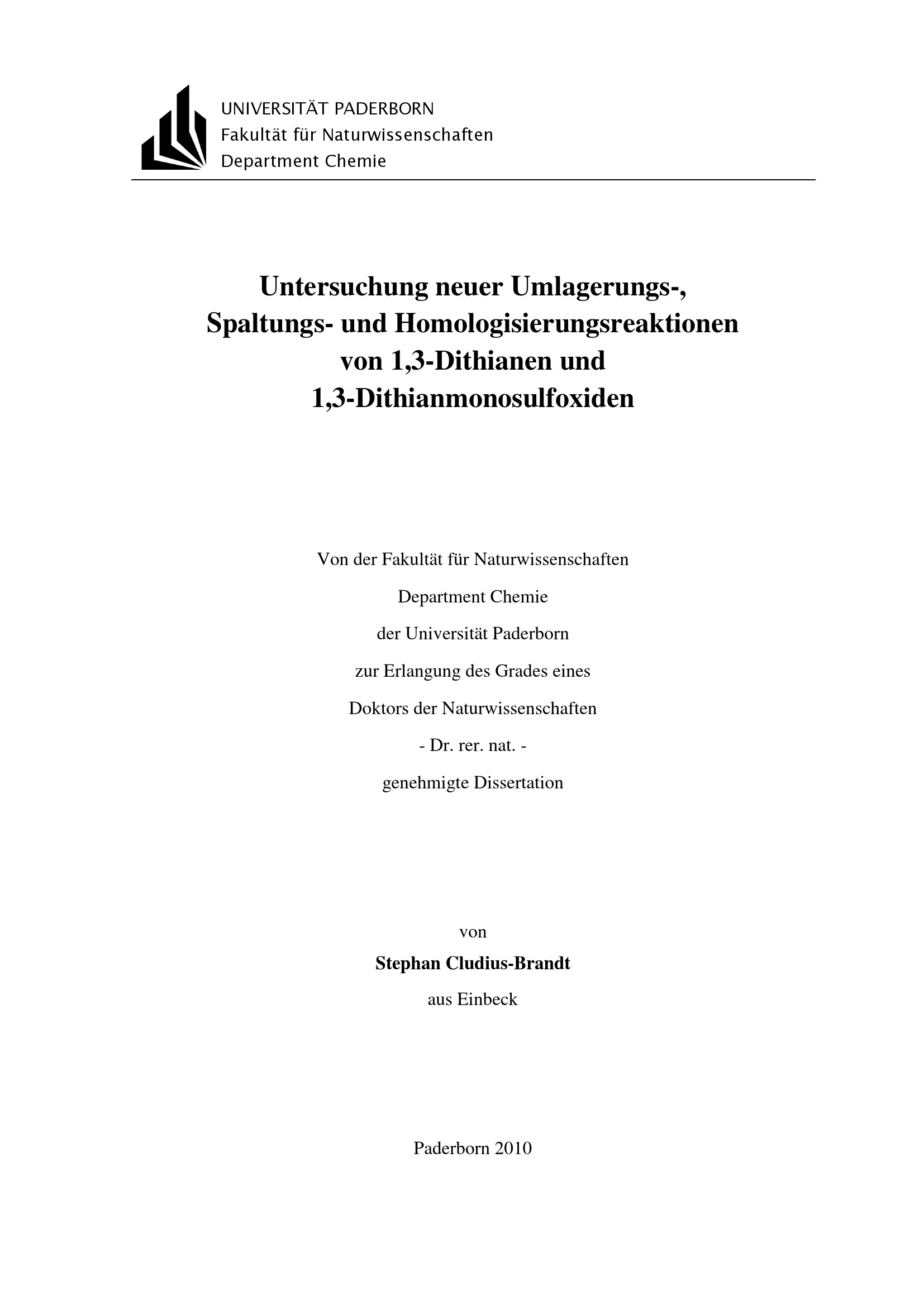 Untersuchung neuer Umlagerungs-, Spaltungs- und Homologisierungsreaktionen von 1,3-Dithianen und 1,3-Dithianmonosulfoxiden / Stephan Cludius-Brandt