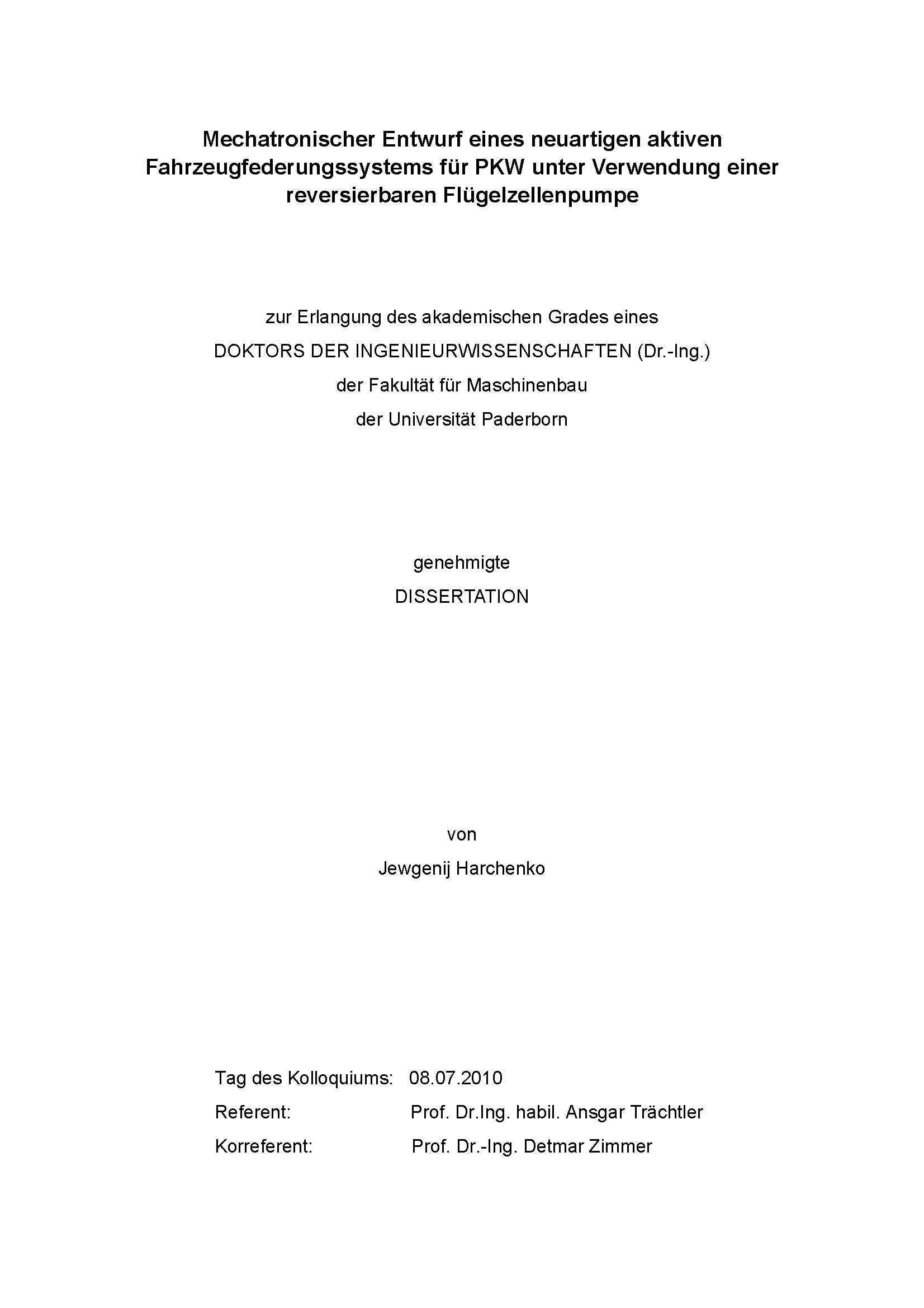 Mechatronischer Entwurf eines neuartigen aktiven Fahrzeugfederungssystems für PKW unter Verwendung einer reversierbaren Flügelzellenpumpe / Jewgenij Harchenko