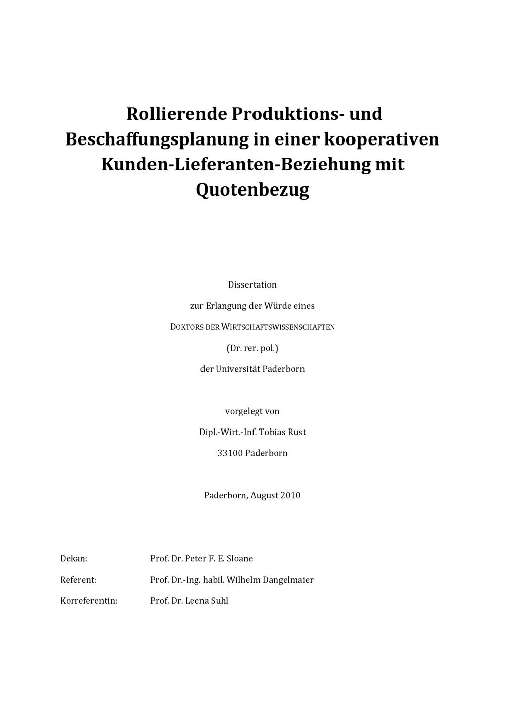 Rollierende Produktions- und Beschaffungsplanung in einer kooperativen Kunden-Lieferanten-Beziehung mit Quotenbezug / Tobias Rust