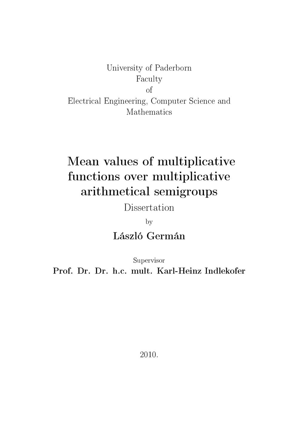 Mean values of multiplicative functions over multiplicative arithmetical semigroups / László Germán
