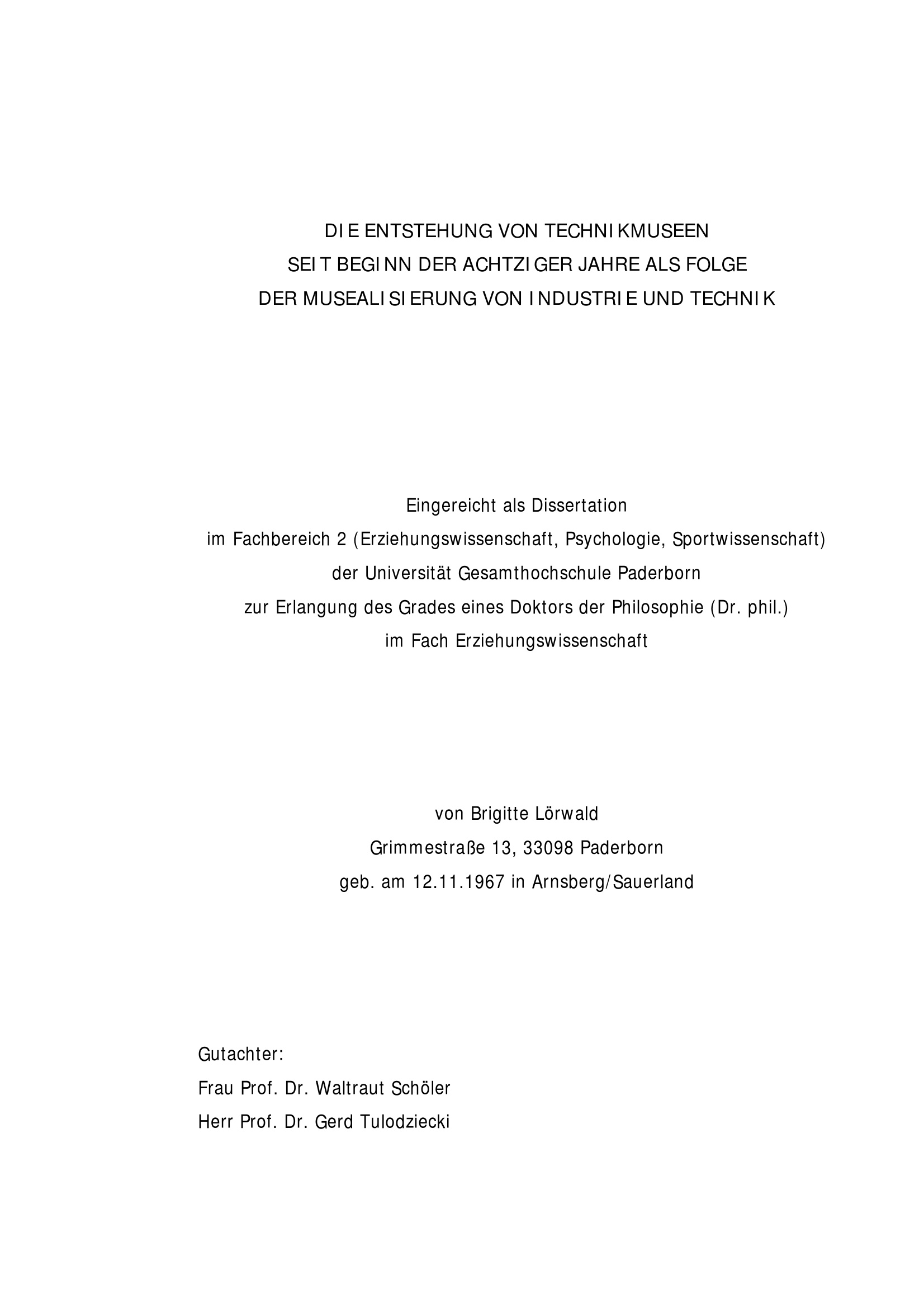 Die Entstehung von Technikmuseen seit Beginn der achtziger Jahre als Folge der Musealisierung von Industrie und Technik / von Brigitte Lörwald