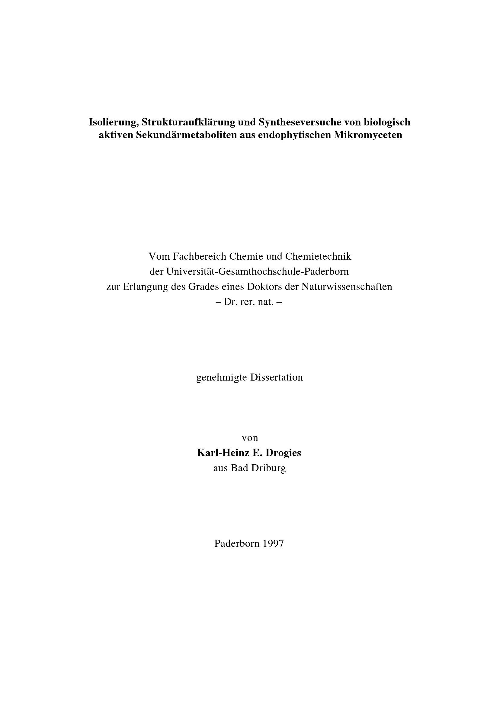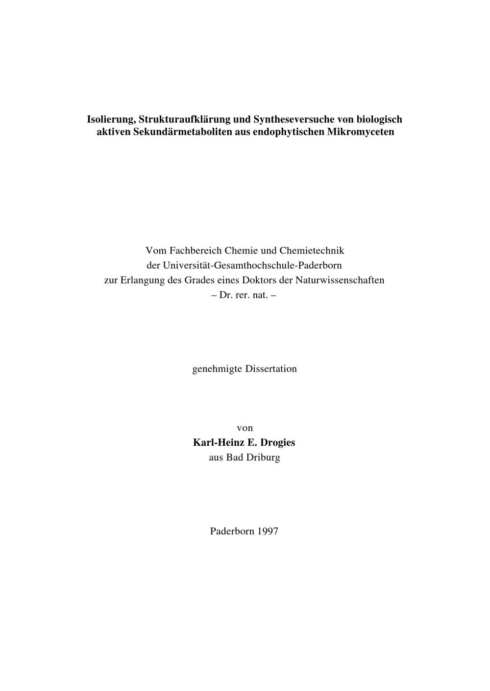 Isolierung, Strukturaufklärung und Syntheseversuche von biologisch aktiven Sekundärmetaboliten aus endophytischen Mikromyceten / von Karl-Heinz E. Drogies