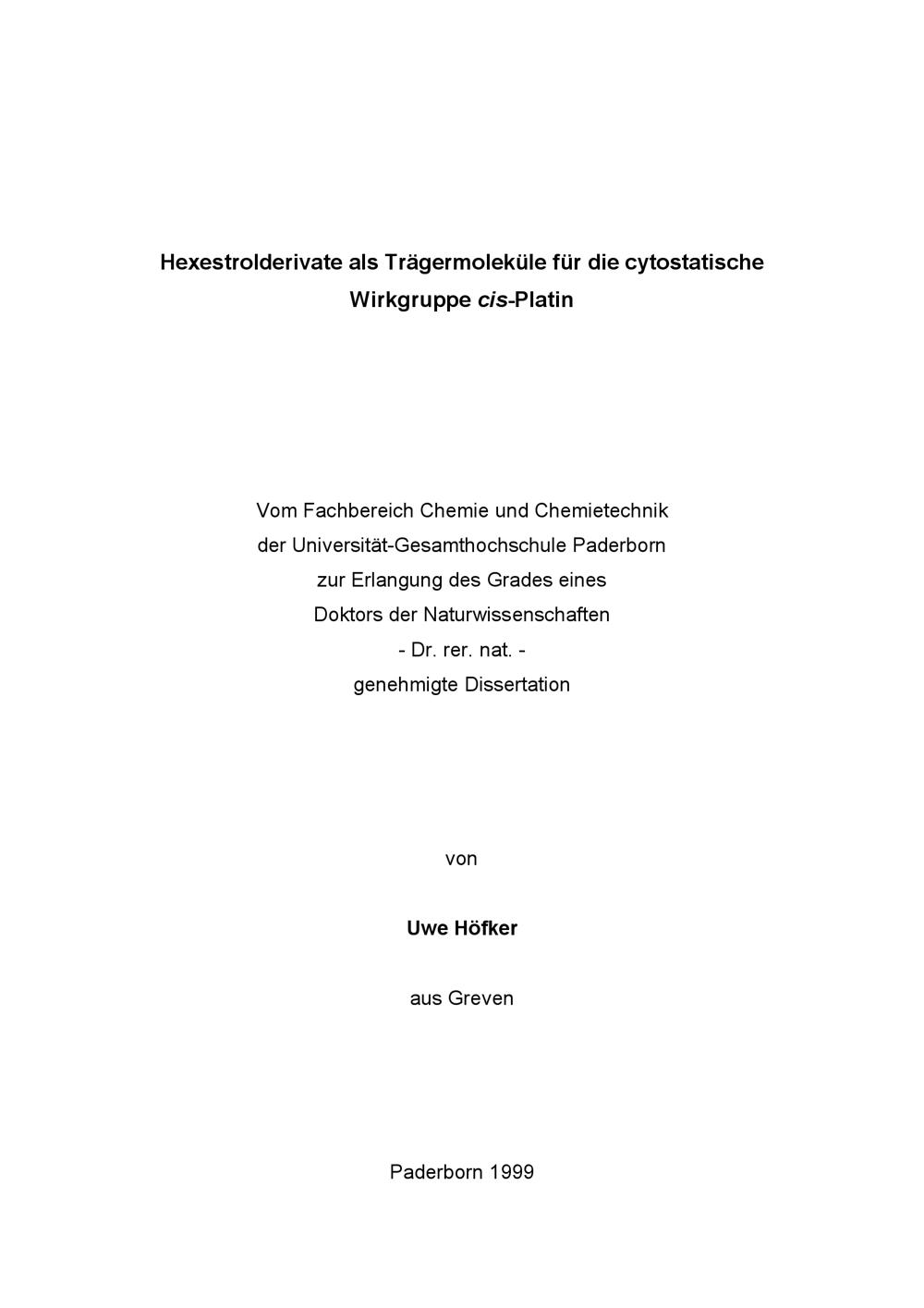 Hexestrolderivate als Trägermoleküle für die cytostatische Wirkgruppe cis-Platin / von Uwe Höfker