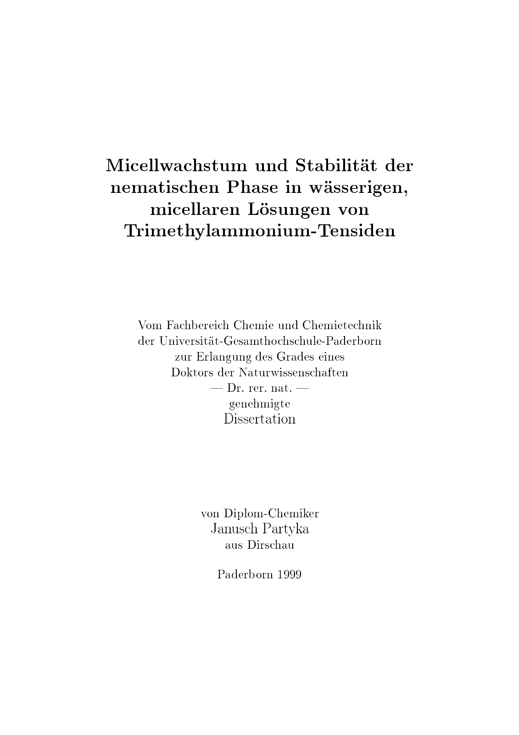 Micellwachstum und Stabilität der nematischen Phase in wässerigen, micellaren Lösungen von Trimethylammonium-Tensiden / von Janusch Partyka
