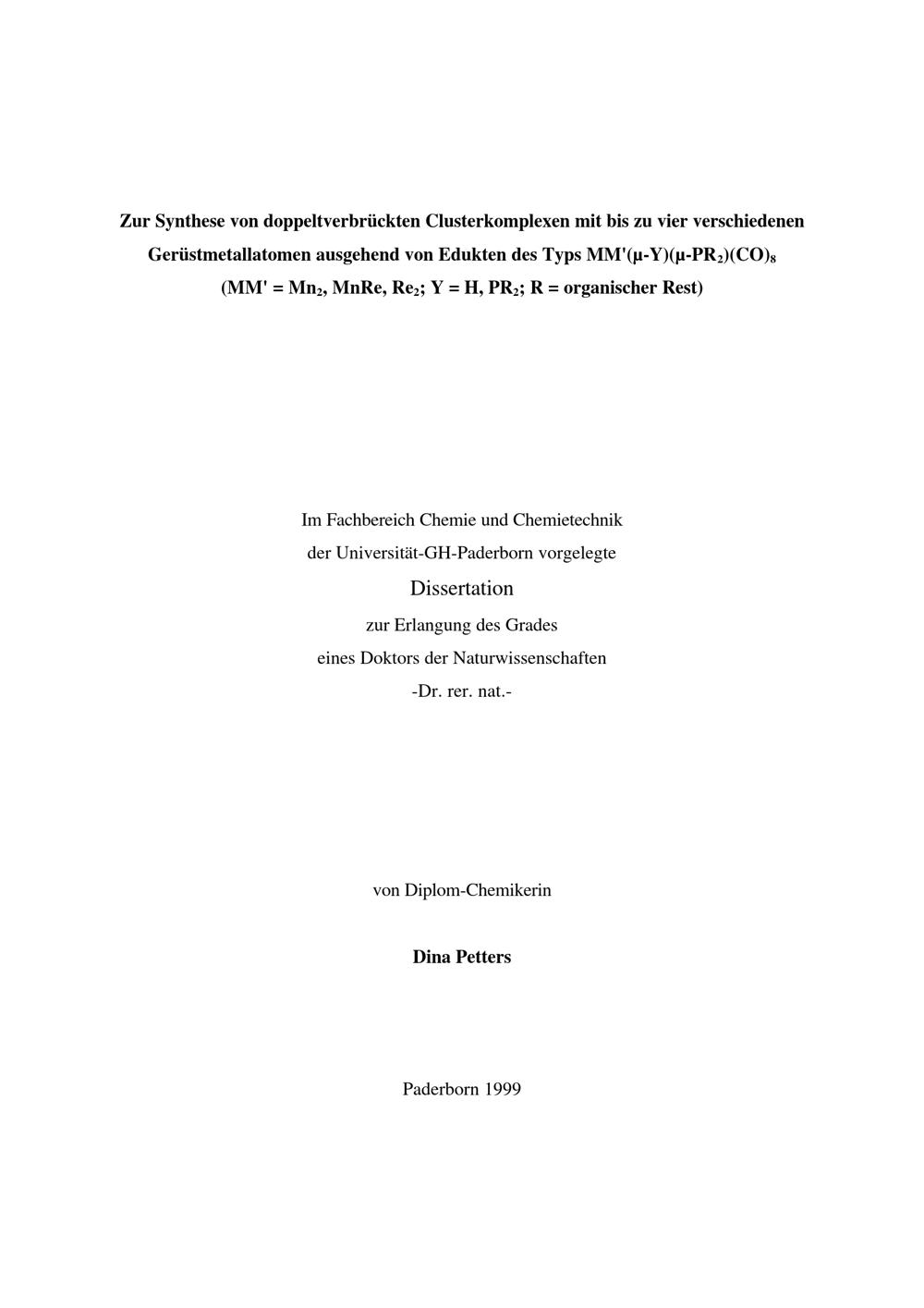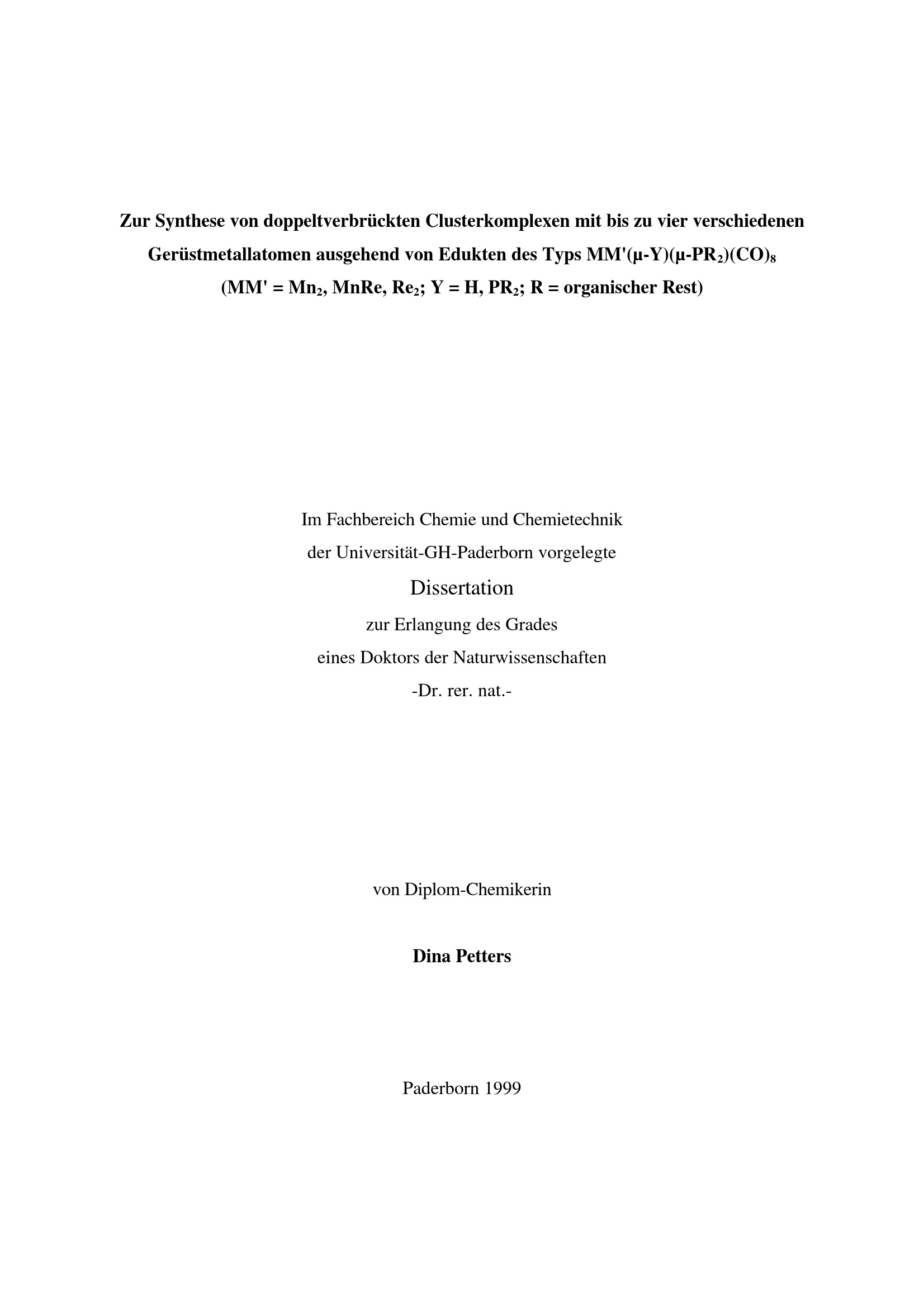 Zur Synthese von doppeltverbrückten Clusterkomplexen mit bis zu vier verschiedenen Gerüstmetallatomen ausgehend von Edukten des Typs MM'(my-Y)(my-PR 2)(CO) 8 (MM'=Mn 2, MnRe, Re 2; Y=H, PR 2; R=organischer Rest) / von Dina Petters