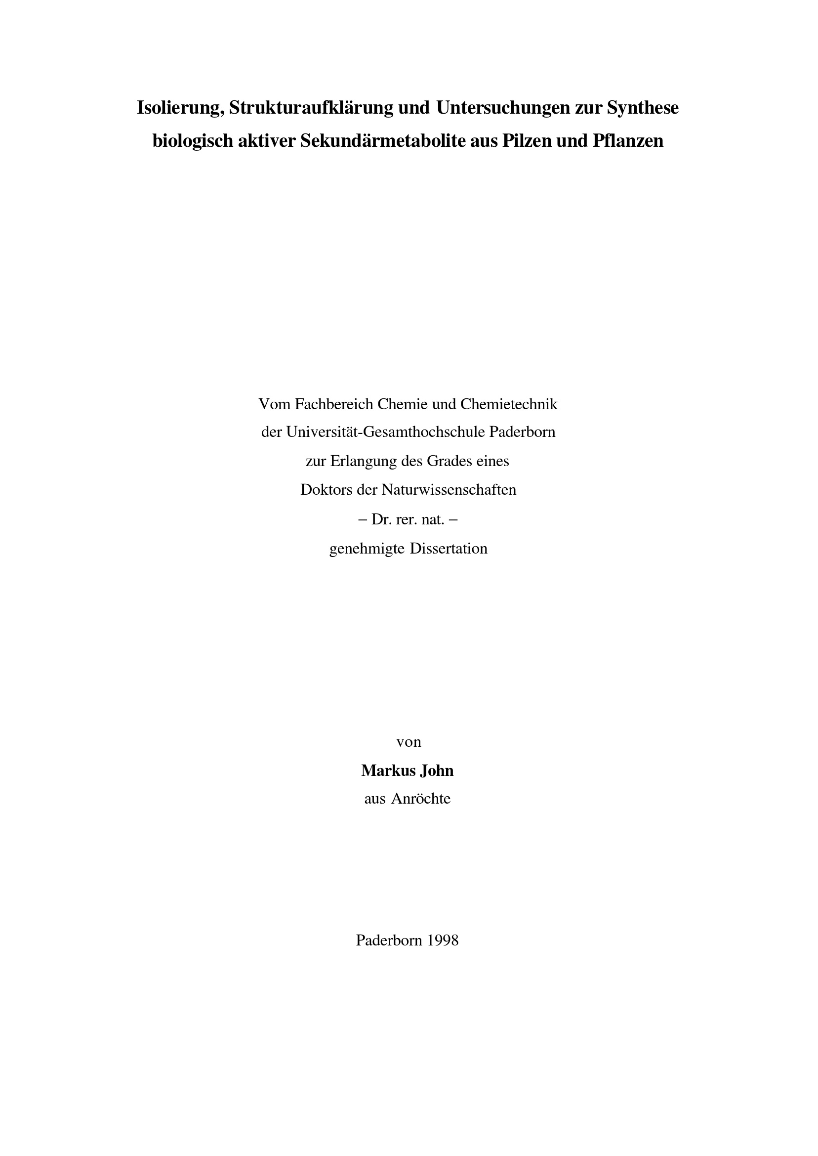 Isolierung, Strukturaufklärung und Untersuchungen zur Synthese biologisch aktiver Sekundärmetabolite aus Pilzen und Pflanzen / von Markus John