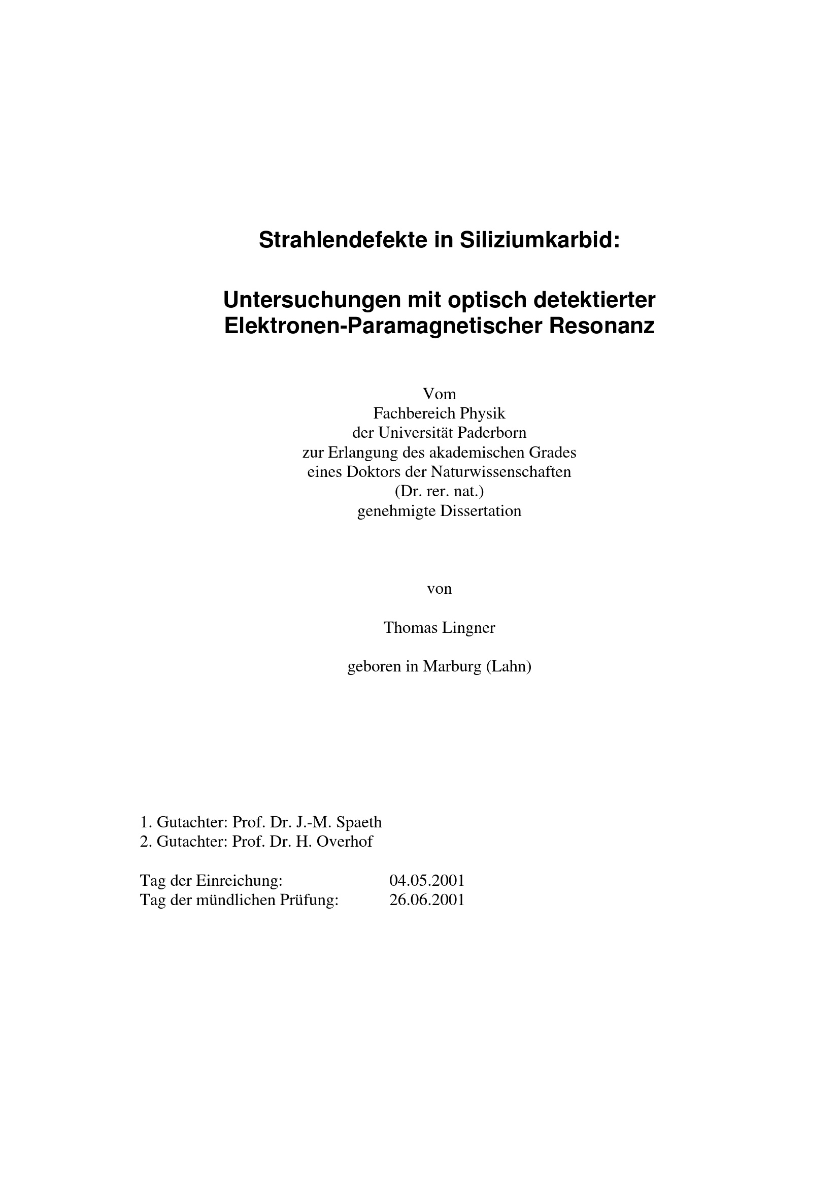Strahlendefekte in Siliziumkarbid : Untersuchungen mit optisch detektierter Elektronen-paramagnetischer Resonanz / von Thomas Lingner