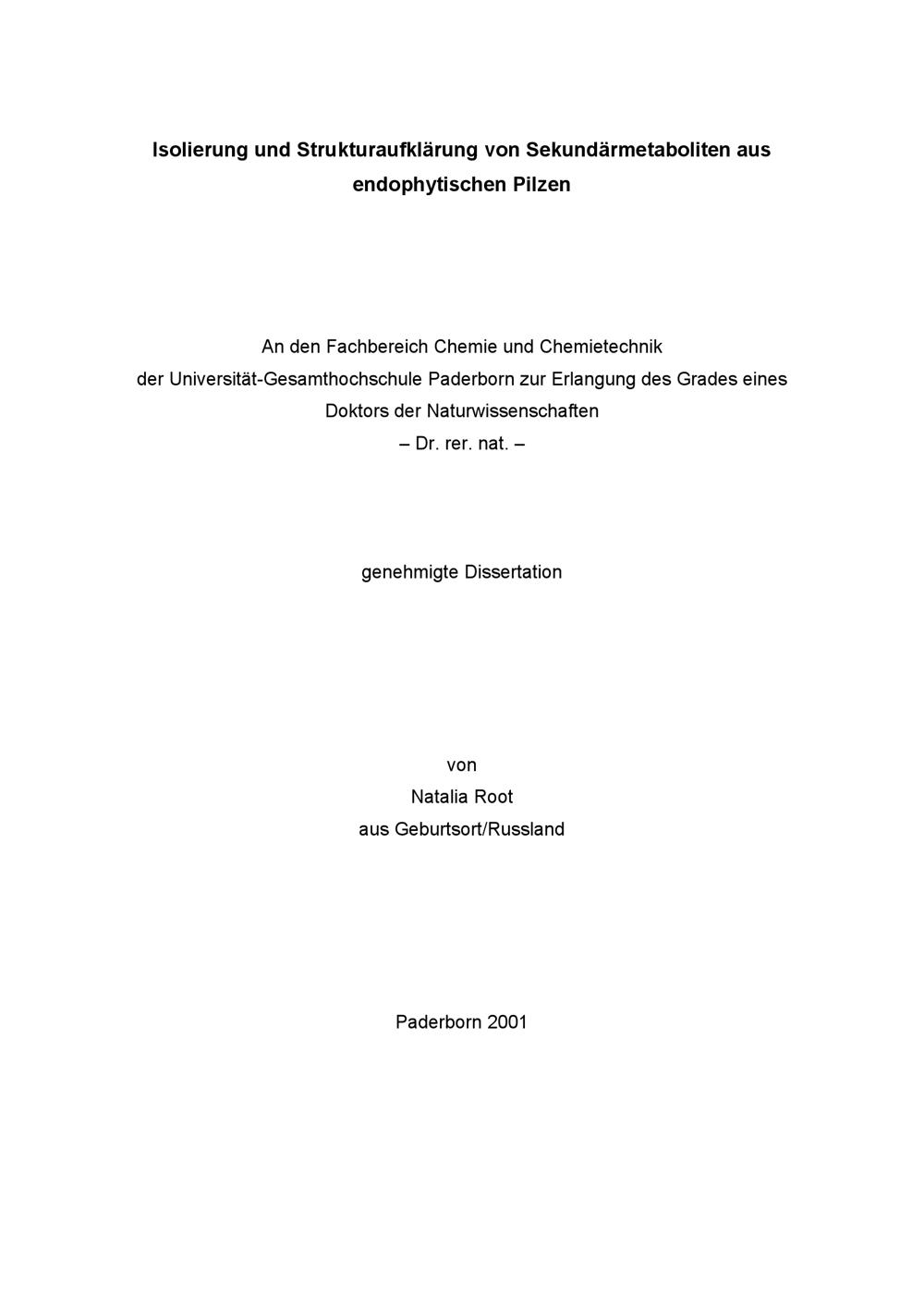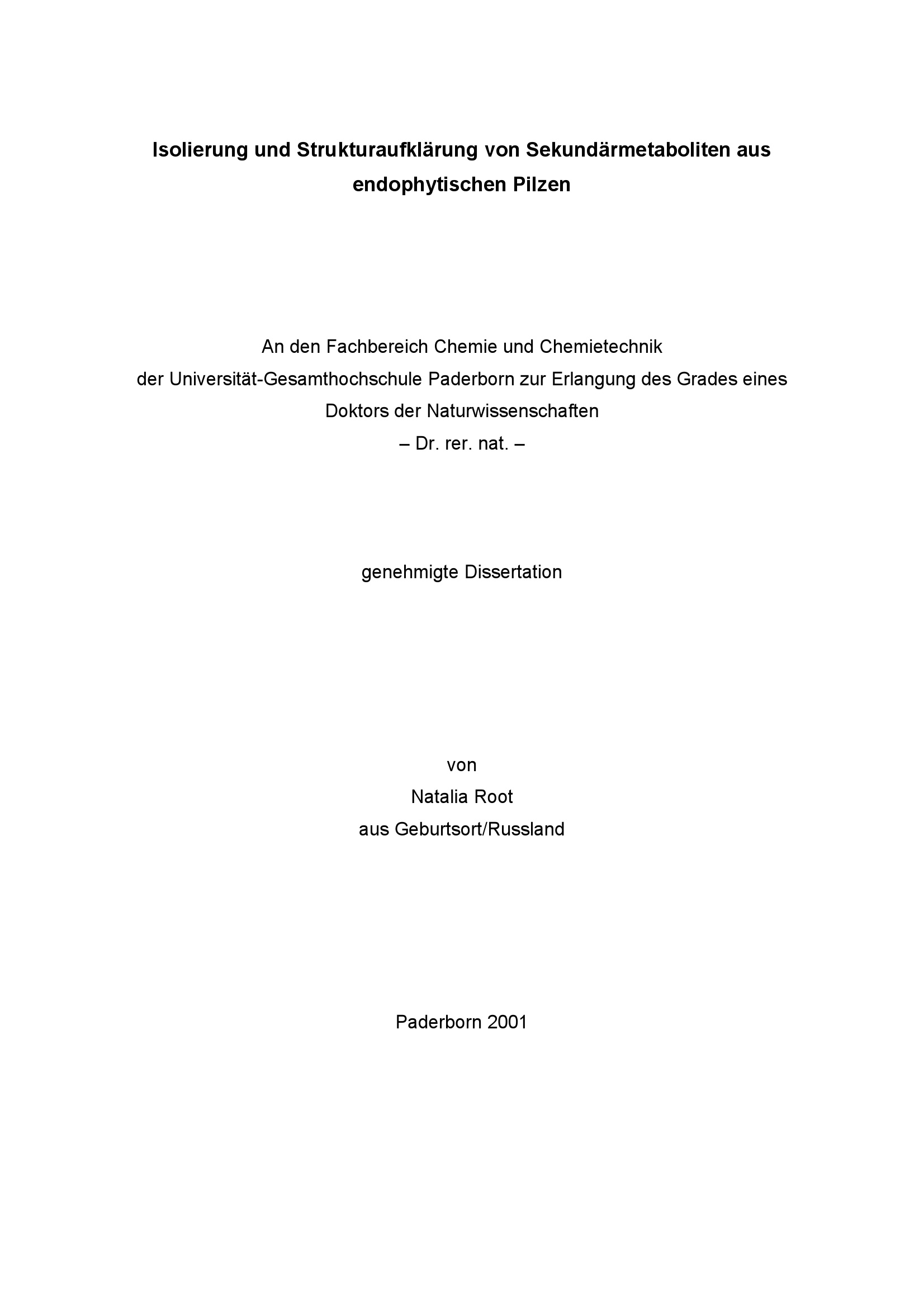 Isolierung und Strukturaufklärung von Sekundärmetaboliten aus endophytischen Pilzen / von Natalia Root