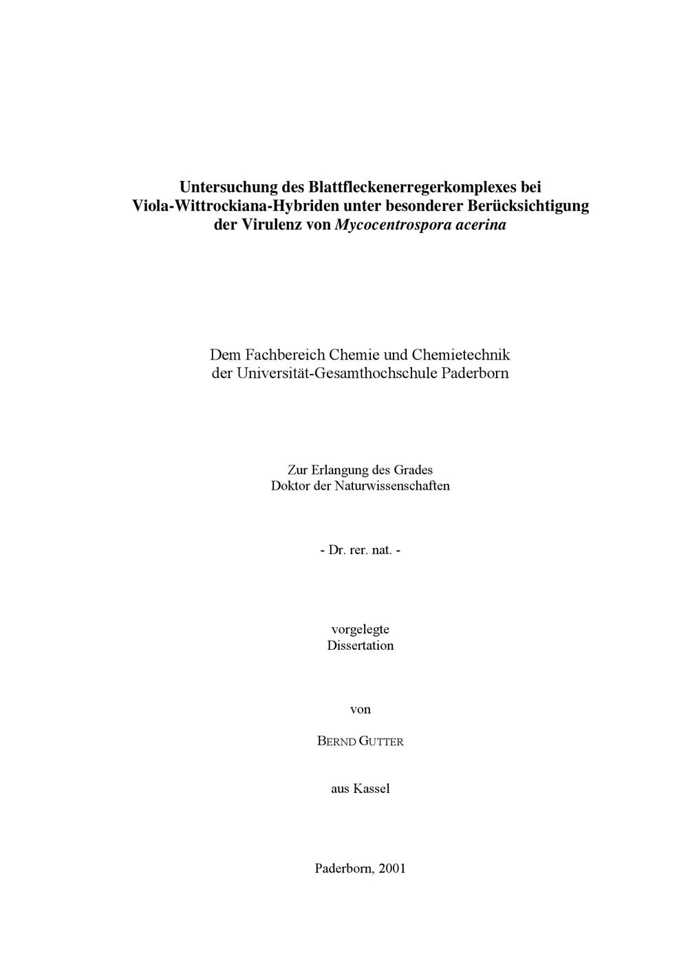Untersuchung des Blattfleckenerregerkomplexes bei Viola-Wittrockiana-Hybriden unter besonderer Berücksichtigung der Virolenz von Mycocentrospora acerina / von Bernd Gutter