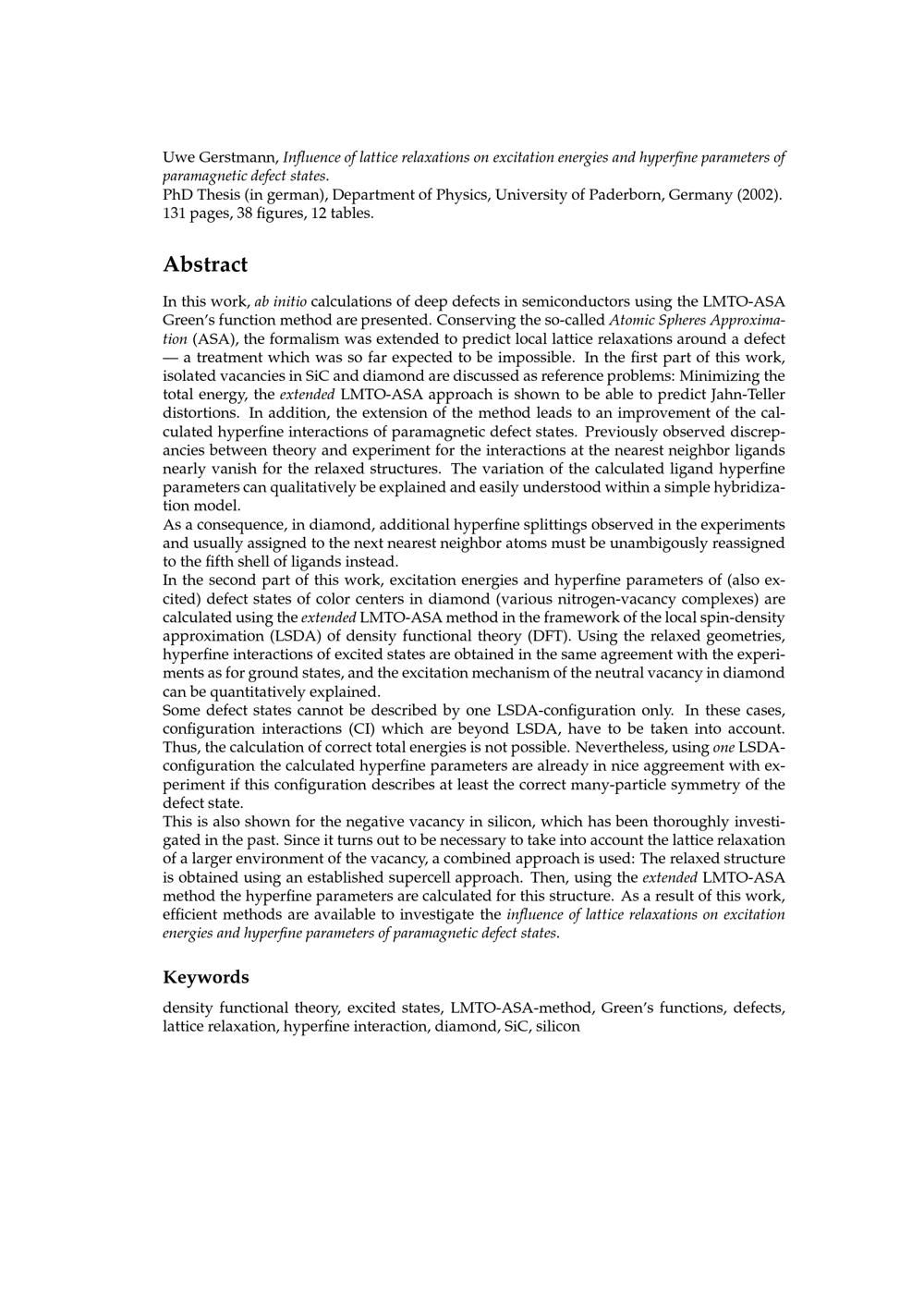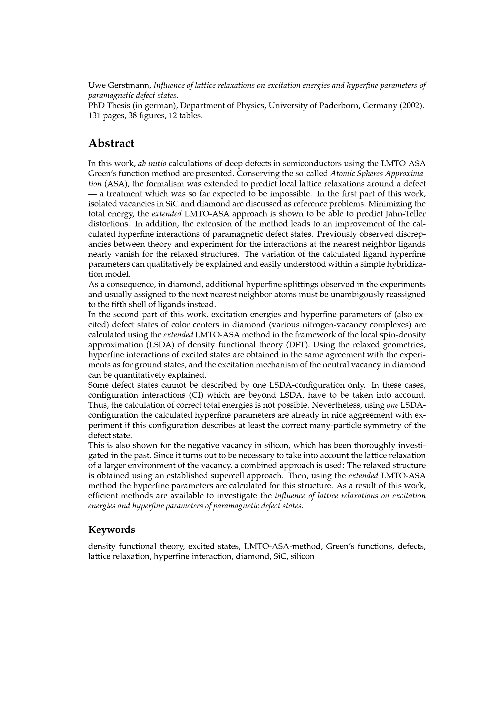 Einfluß von Gitterverzerrungen auf Anregungsenergien und Hyperfeinparameter paramagnetischer Defekte / Uwe Gerstmann
