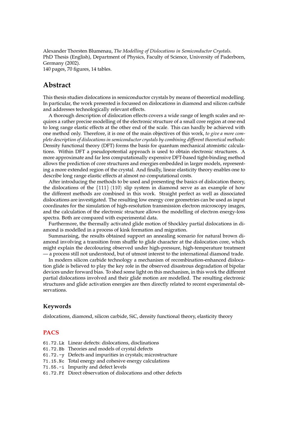 The modelling of dislocations in semiconductor crystals / Alexander Thorsten Blumenau