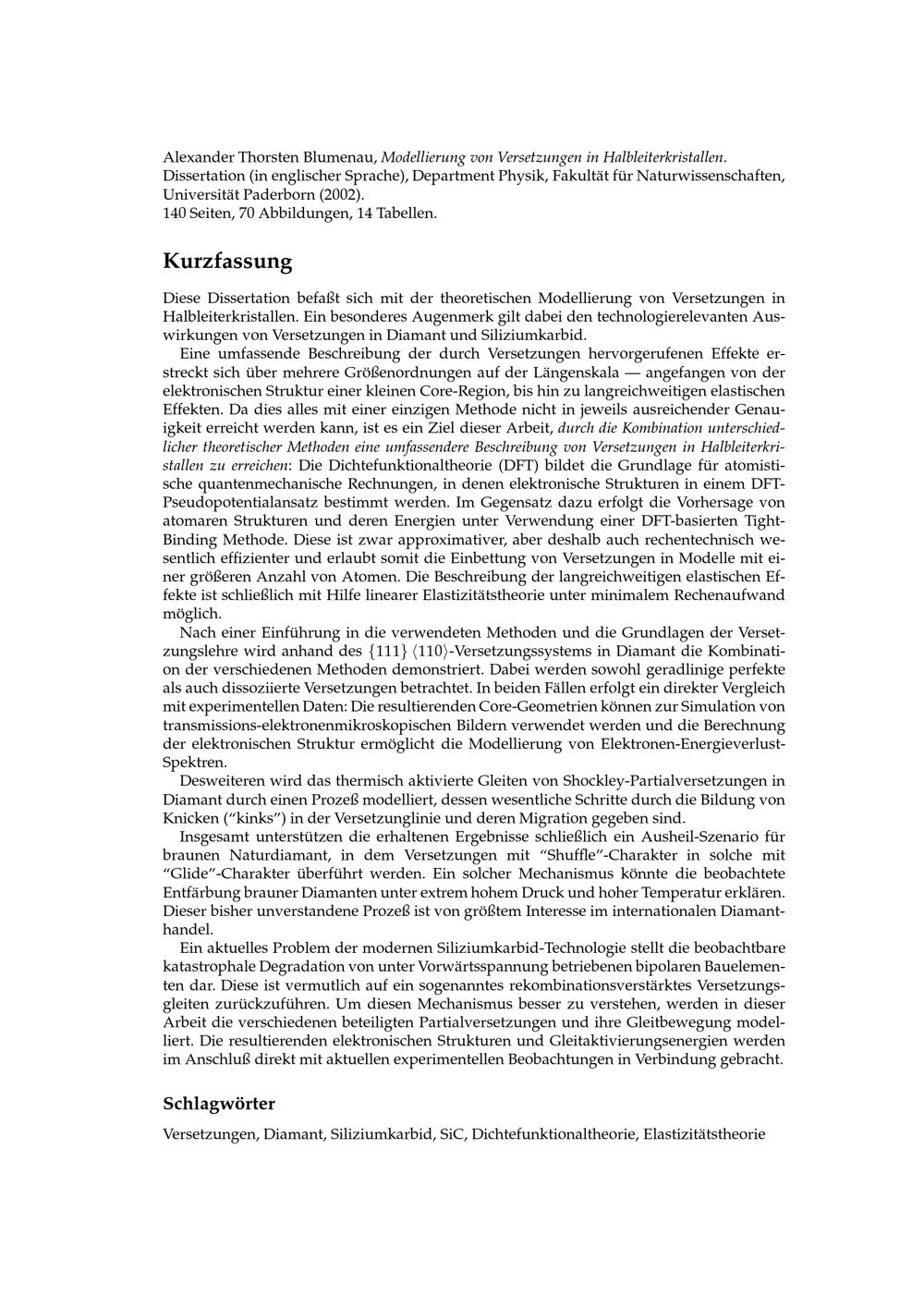 The modelling of dislocations in semiconductor crystals / Alexander Thorsten Blumenau
