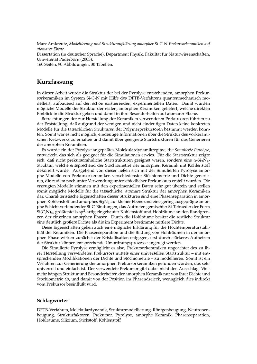 Modellierung und Strukturaufklärung amorpher Si-C-N-Prekursorkeramiken auf atomarer Ebene / Marc Amkreutz