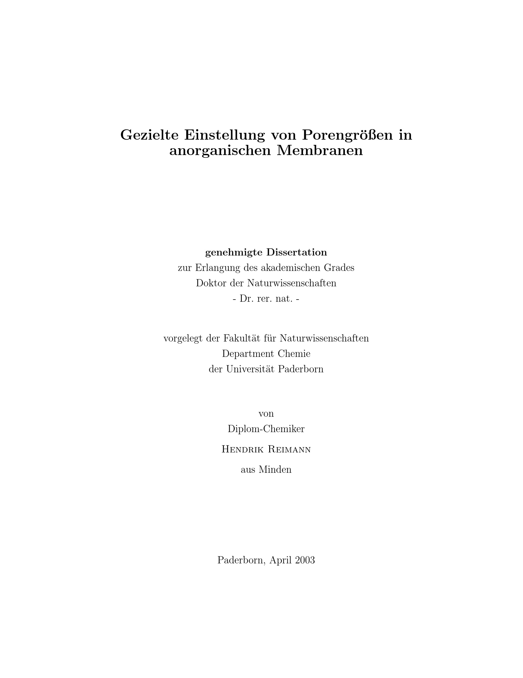 Gezielte Einstellung von Porengrößen in anorganischen Membranen / von Hendrik Reimann
