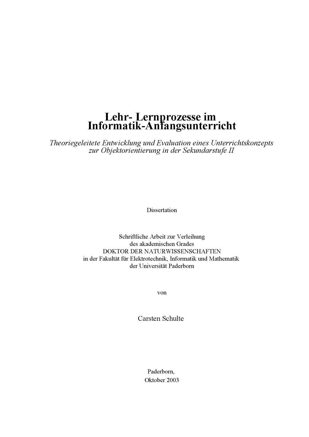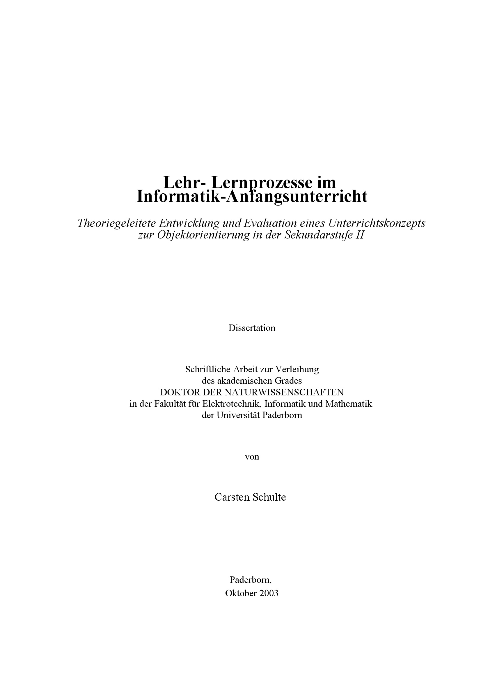 Lehr-, Lernprozesse im Informatik-Anfangsunterricht : theoriegeleitete Entwicklung und Evaluation eines Unterrichtskonzepts zur Objektorientierung in der Sekundarstufe II / von Carsten Schulte
