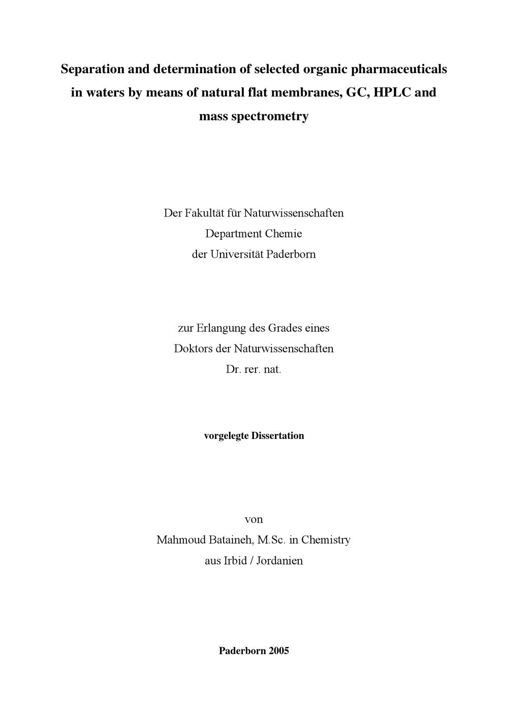 Separation and determination of selected organic pharmaceuticals in waters by means of natural flat membranes, GC, HPLC and mass spectrometry / von Mahmoud Bataineh