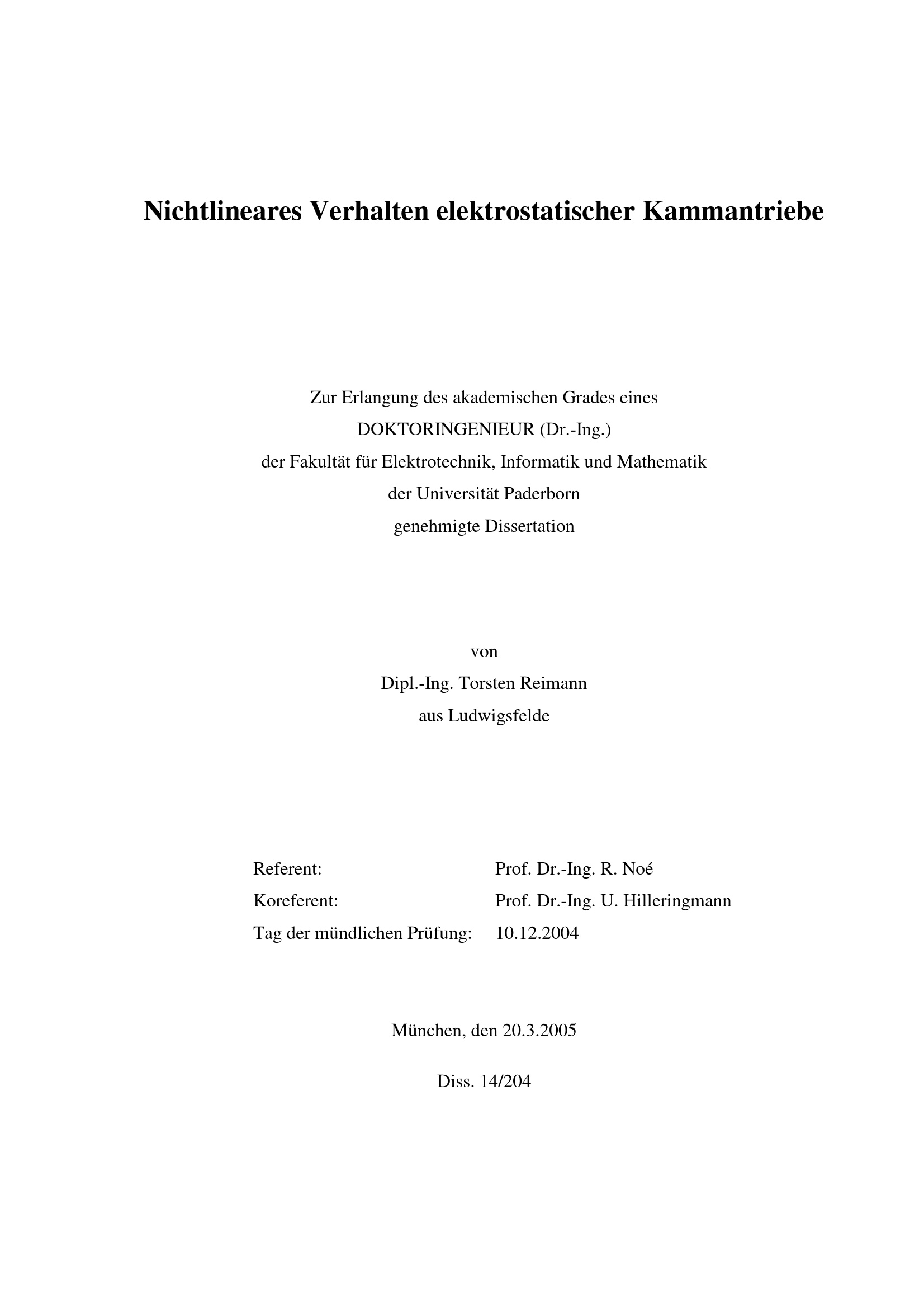 Nichtlineares Verhalten elektrostatischer Kammantriebe / von Torsten Reimann