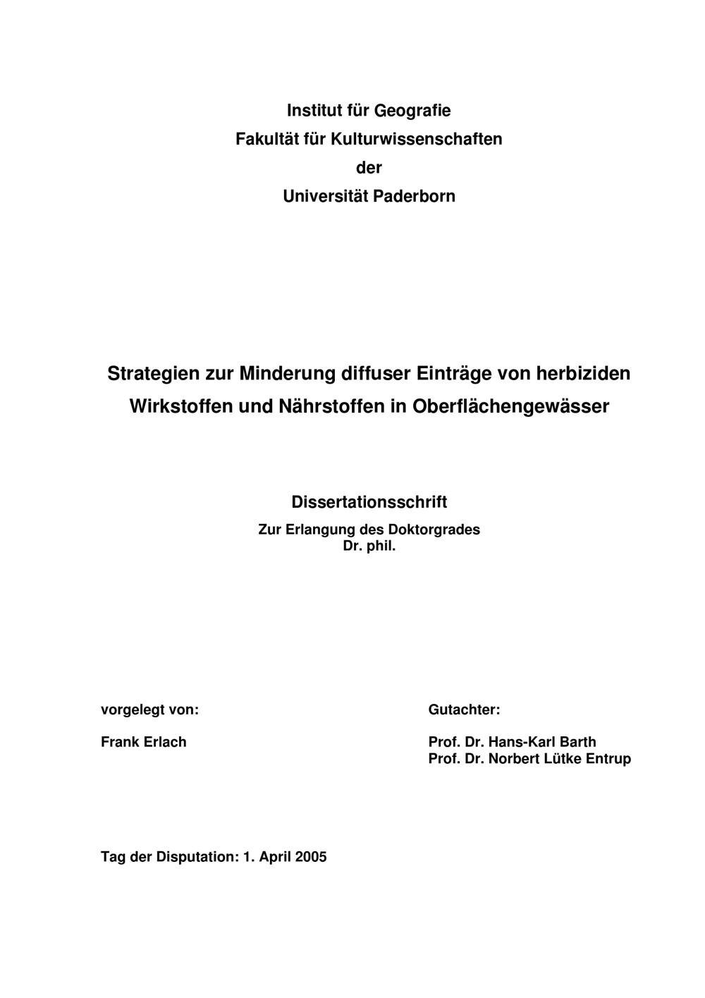 Strategien zur Minderung diffuser Einträge von herbiziden Wirkstoffen und Nährstoffen in Oberflächengewässer / von Frank Erlach