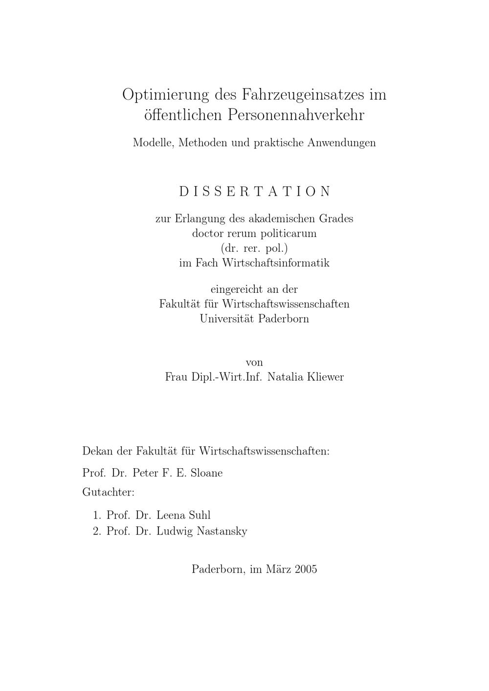 Optimierung des Fahrzeugeinsatzes im öffentlichen Personennahverkehr : Modelle, Methoden und praktische Anwendungen / von Natalia Kliewer