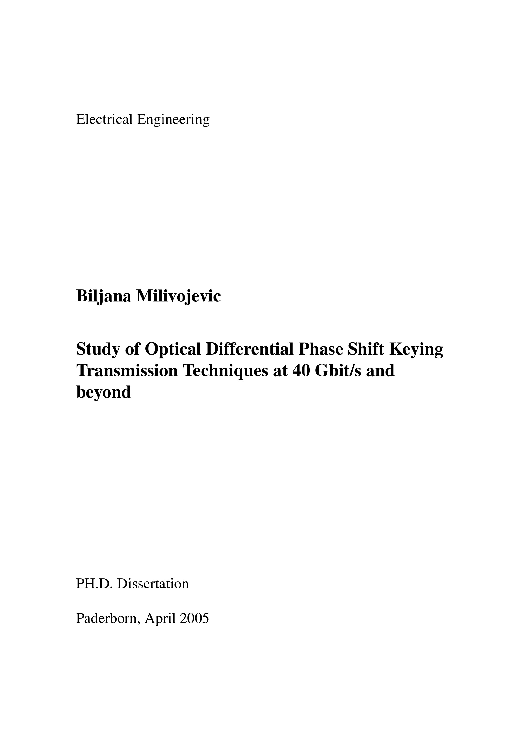Study of optical differential phase shift keying transmission techniques at 40 Gbit/s and beyond / Biljana Milivojevic