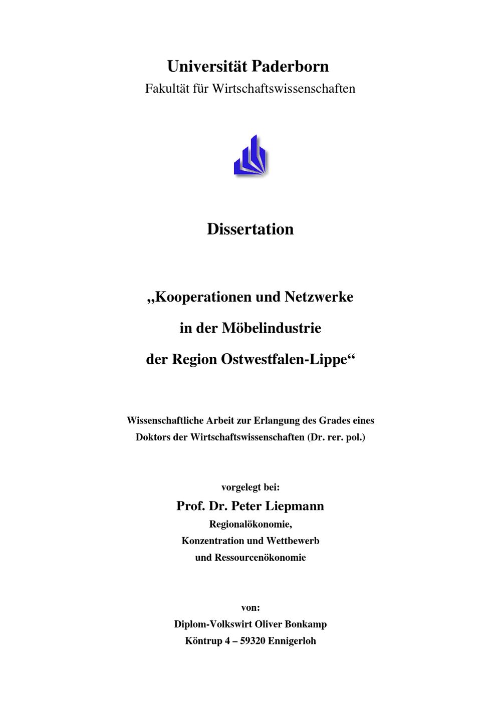 Kooperationen und Netzwerke in der Möbelindustrie der Region Ostwestfalen-Lippe / von Oliver Bonkamp