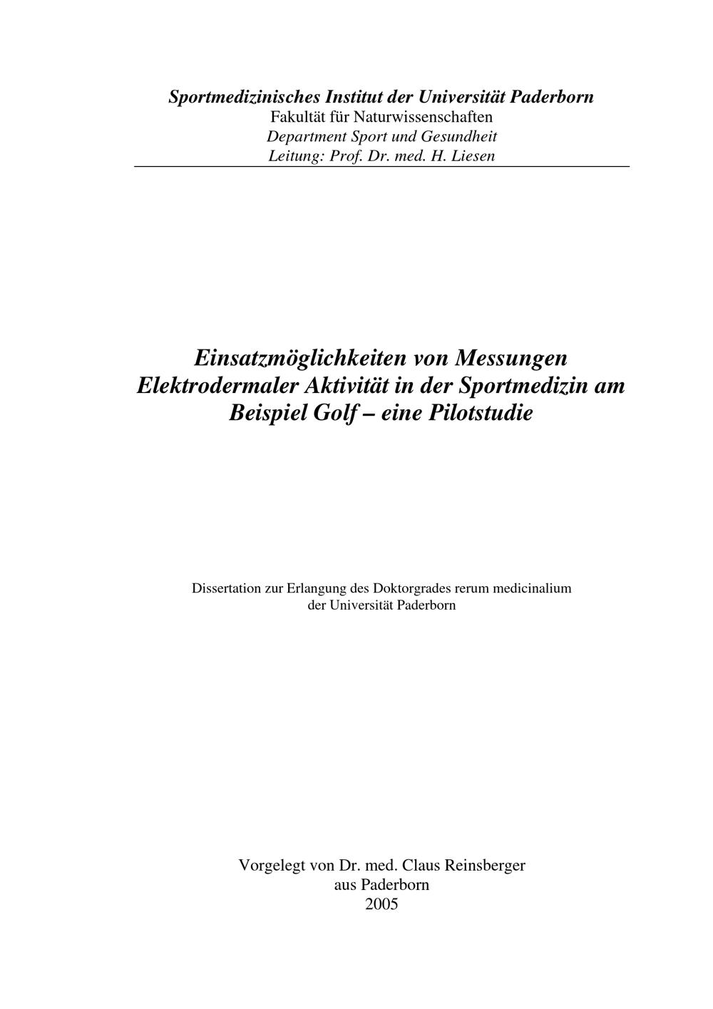 Einsatzmöglichkeiten von Messungen elektrodermaler Aktivität in der Sportmedizin am Beispiel Golf : eine Pilotstudie / von Claus Reinsberger