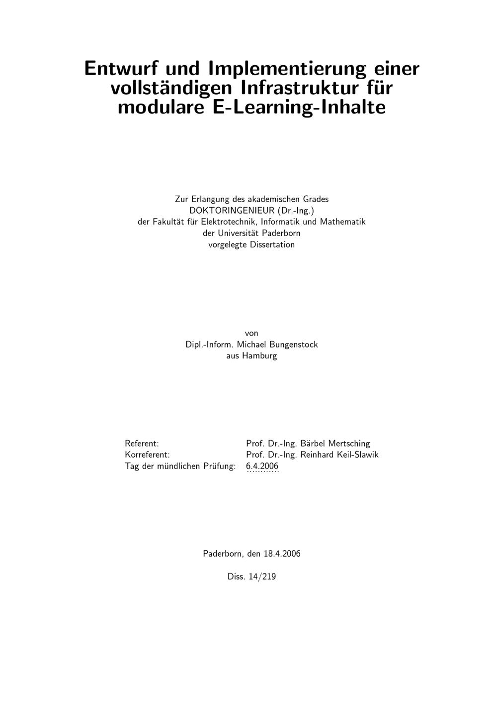 Entwurf und Implementierung einer vollständigen Infrastruktur für modulare E-Learning-Inhalte / von Michael Bungenstock