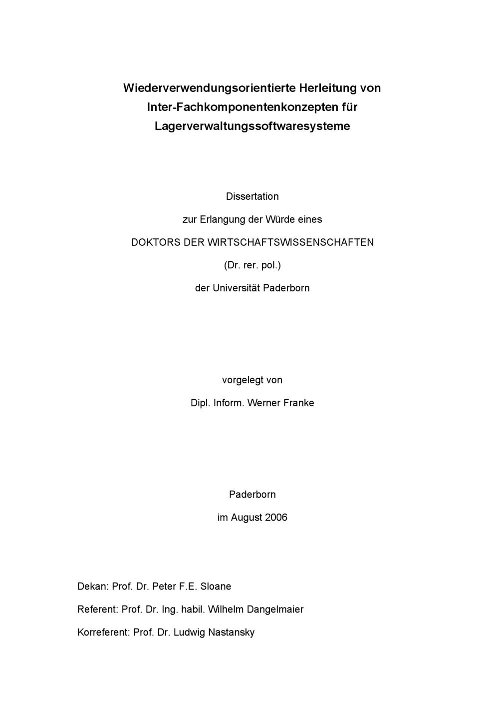 Wiederverwendungsorientierte Herleitung von Inter-Fachkomponentenkonzepten für Lagerverwaltungssoftwaresysteme / von Werner Franke