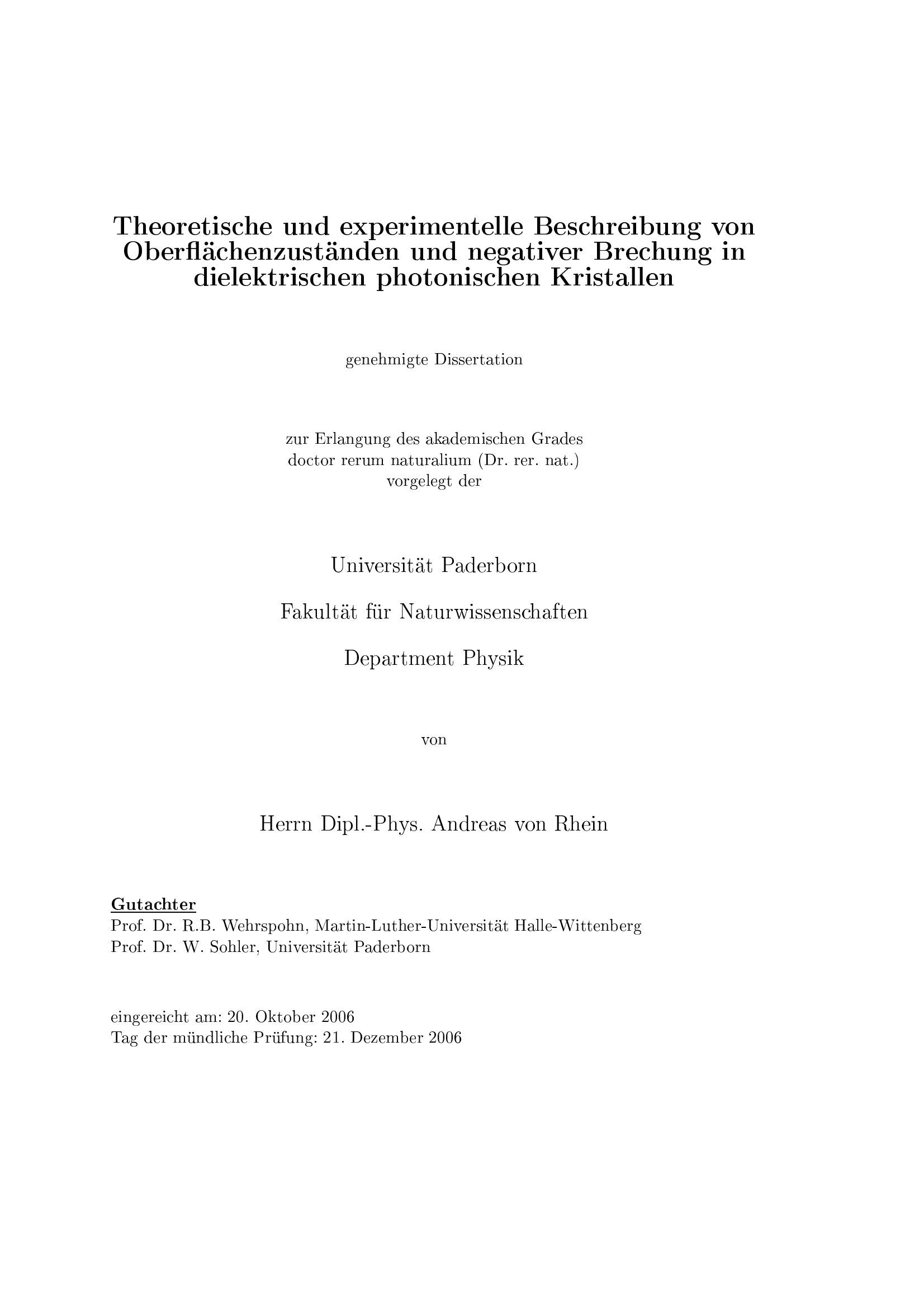 Theoretische und experimentelle Beschreibung von Oberflächenzuständen und negativer Brechung in dielektrischen photonischen Kristallen / von Andreas von Rhein