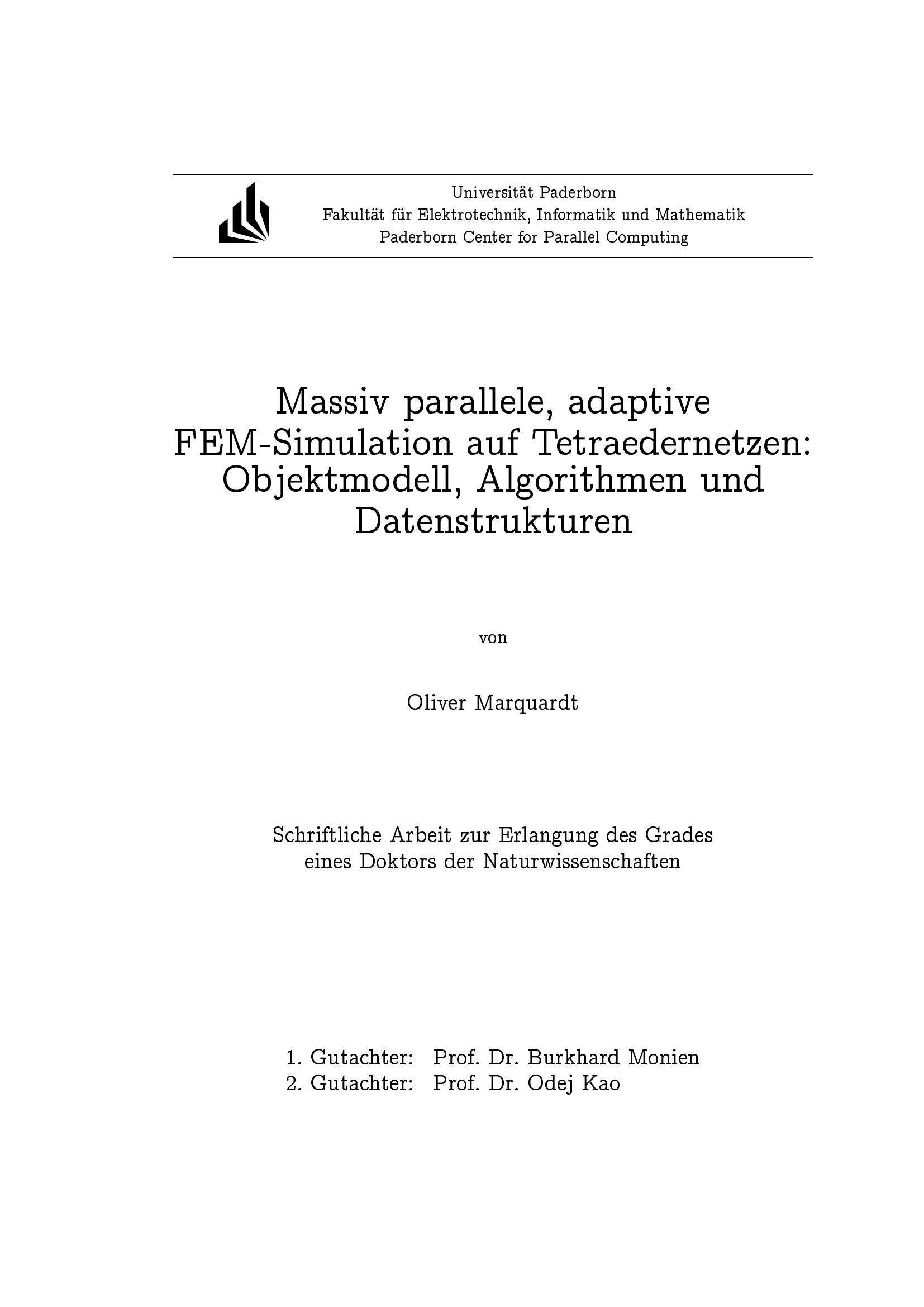 Massiv parallele, adaptive FEM-Simulation auf Tetraedernetzen : Objektmodell, Algorithmen und Datenstrukturen / von Oliver Marquardt