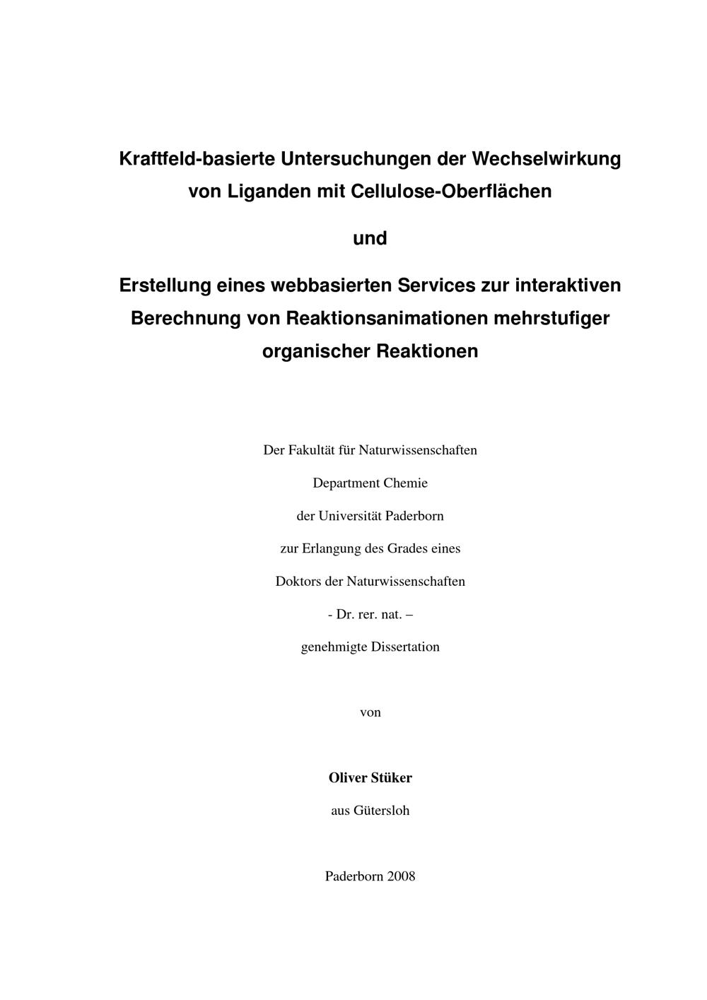 Kraftfeld-basierte Untersuchungen der Wechselwirkung von Liganden mit Cellulose-Oberflächen und Erstellung eines webbasierten Services zur interaktiven Berechnung von Reaktionsanimationen mehrstufiger organischer Reaktionen / von Oliver Stüker