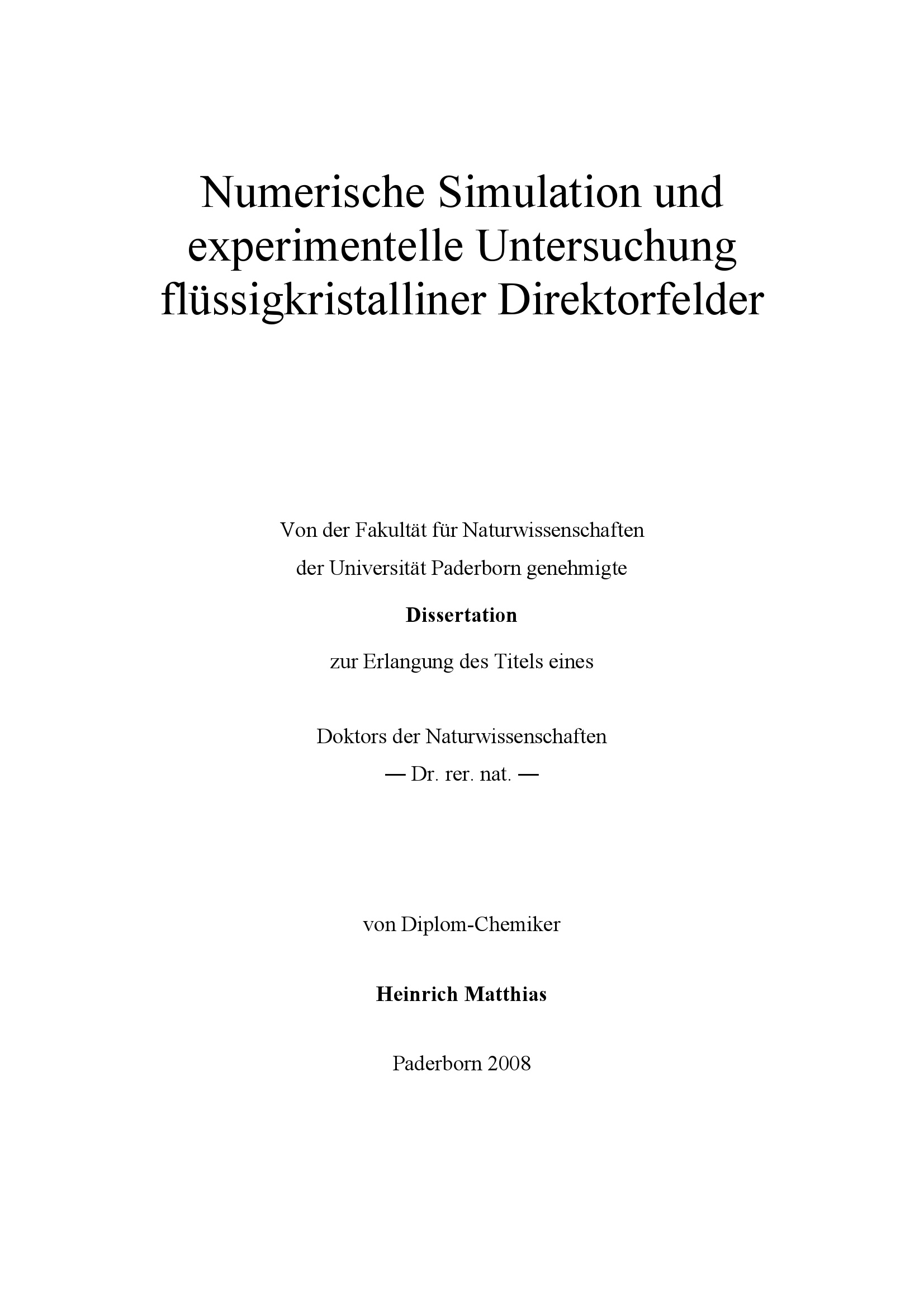 Numerische Simulation und experimentelle Untersuchung flüssigkristalliner Direktorfelder / von Heinrich Matthias