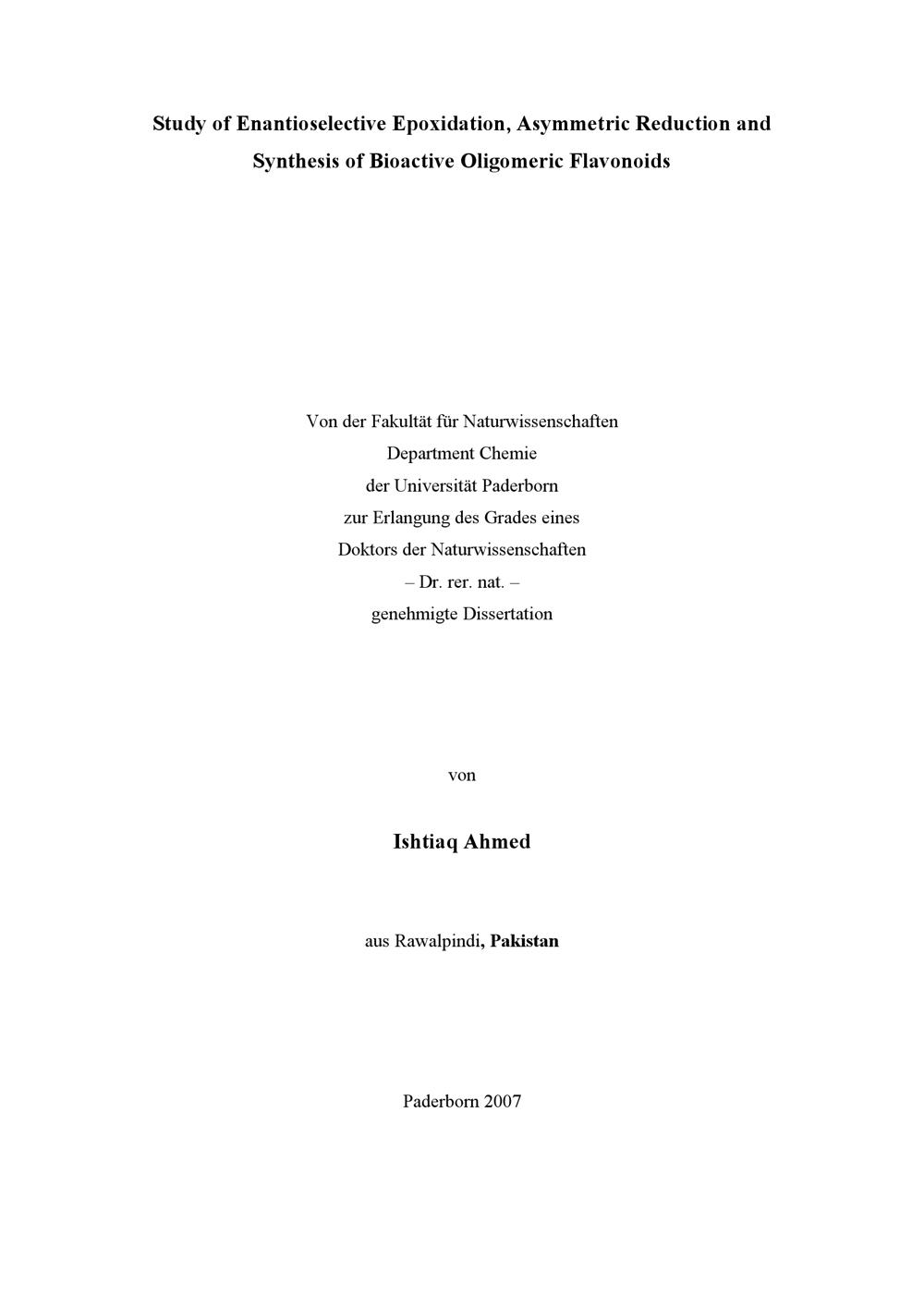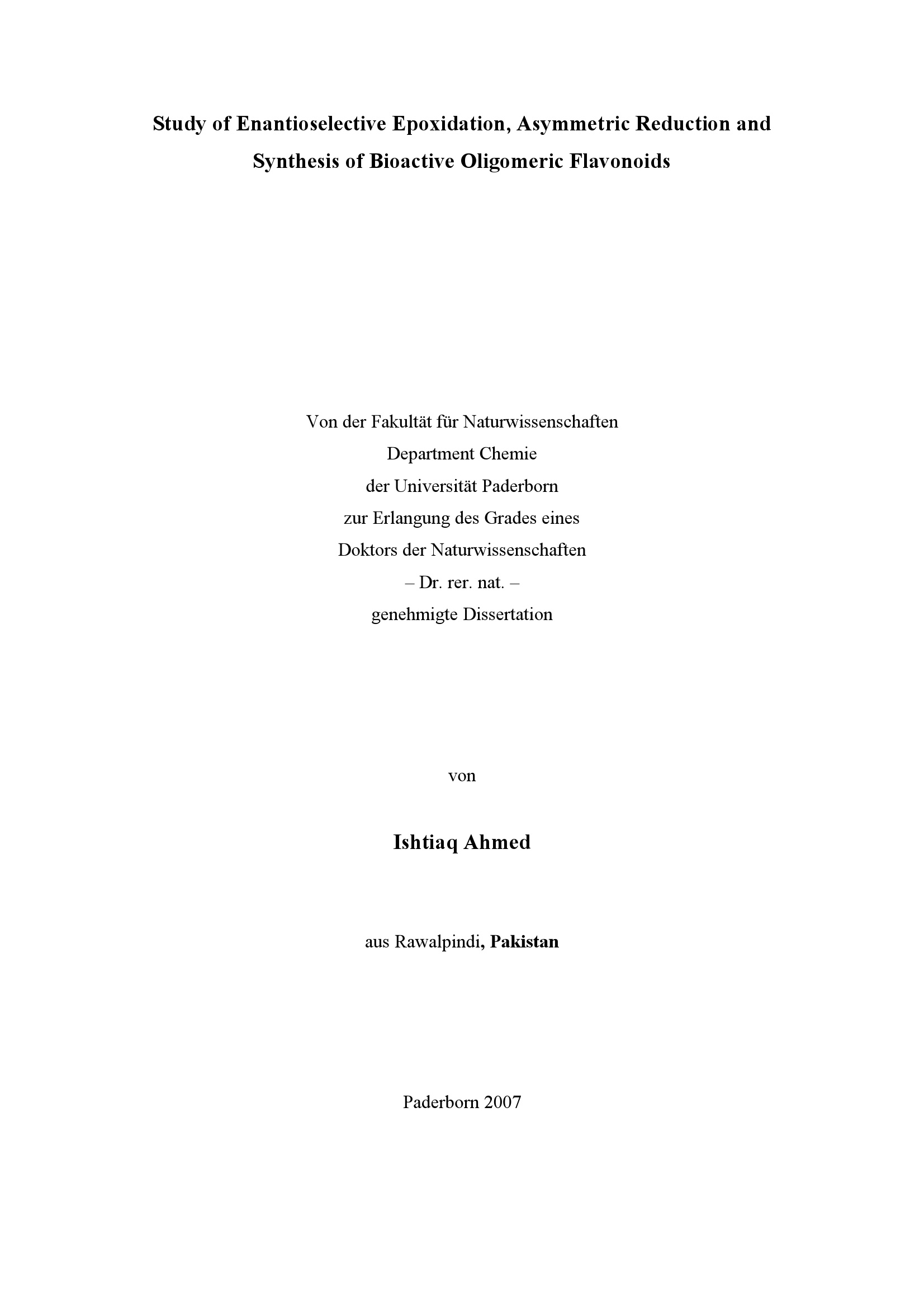 Study of enantioselective epoxidation, asymmetric reduction and synthesis of bioactive oligomeric flavonoids / Ishtiaq Ahmed