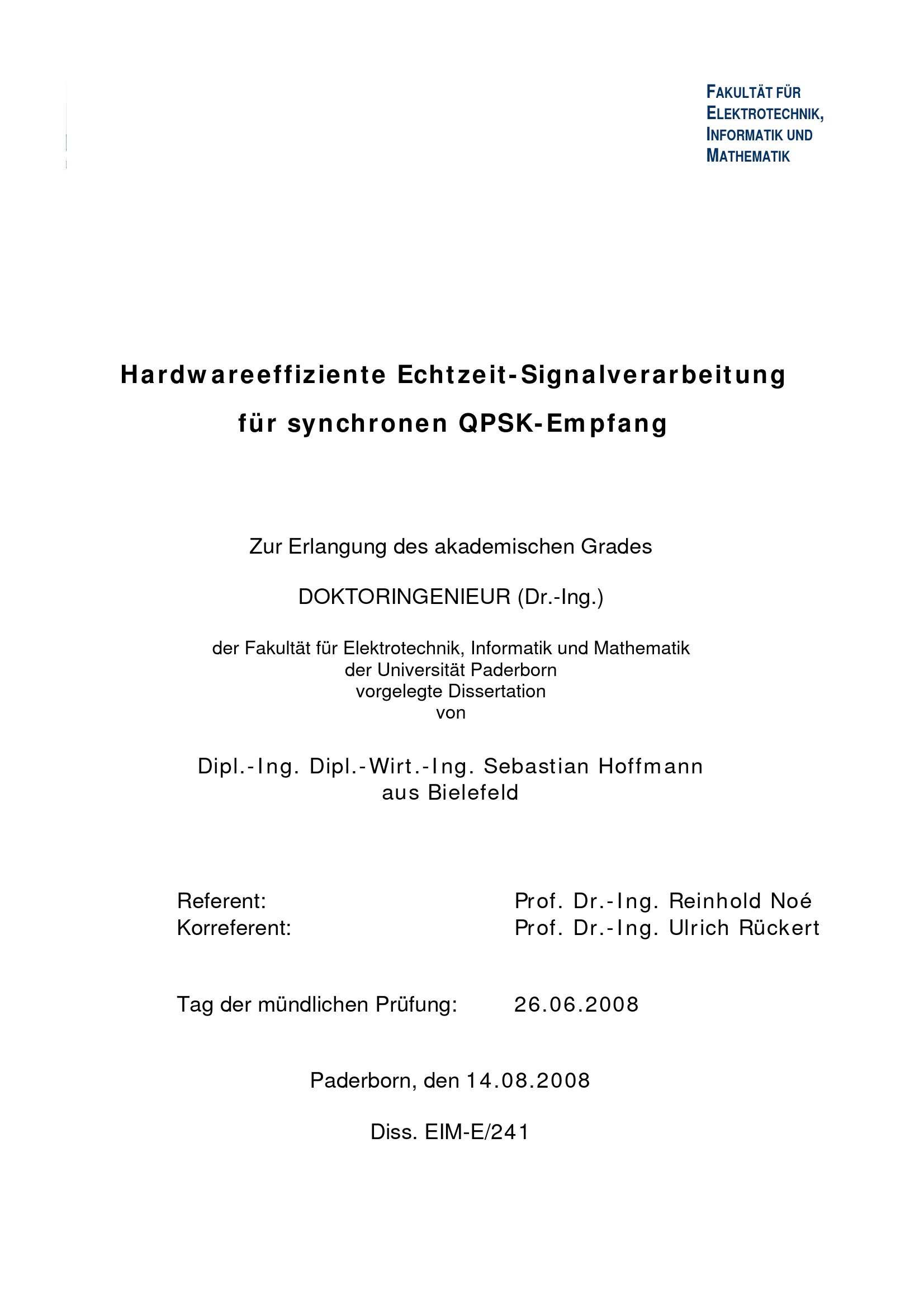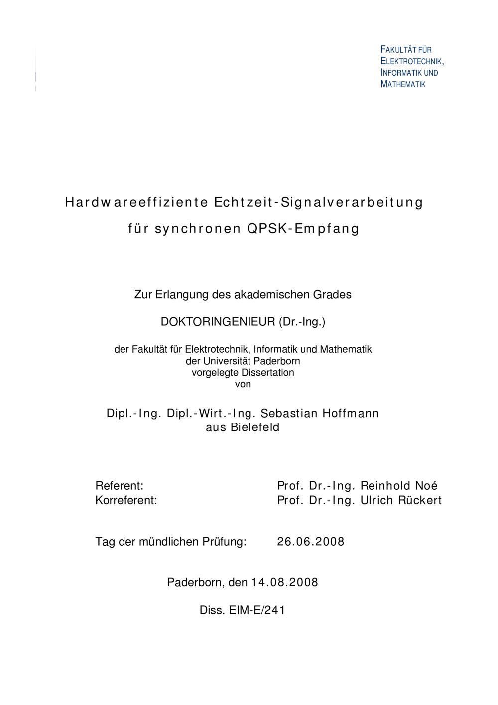Hardwareeffiziente Echtzeit-Signalverarbeitung für synchronen QPSK-Empfang / von Sebastian Hoffmann