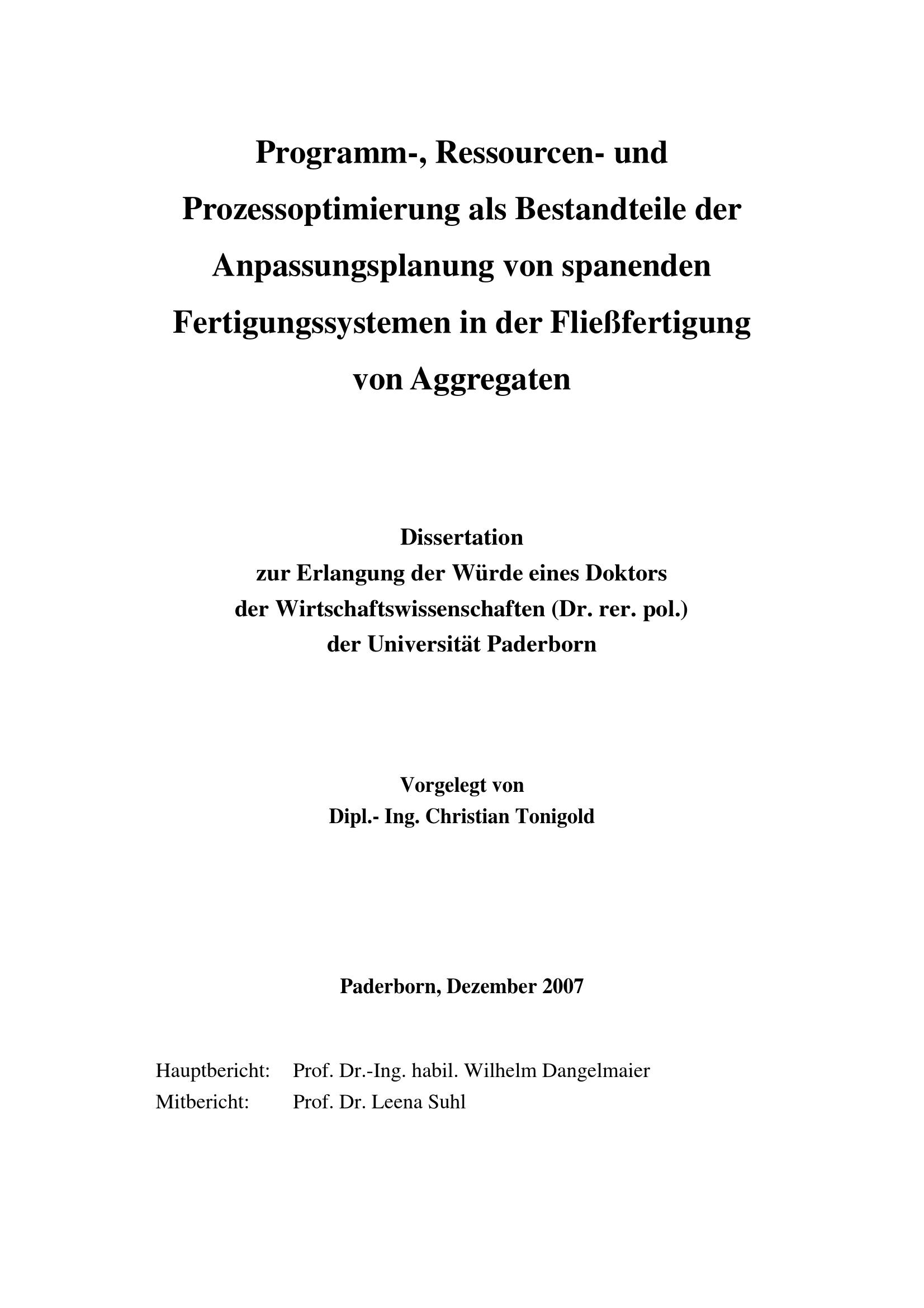 Programm-, Ressourcen- und Prozessoptimierung als Bestandteile der Anpassungsplanung von spanenden Fertigungssystemen in der Fließfertigung von Aggregaten / von Christian Tonigold