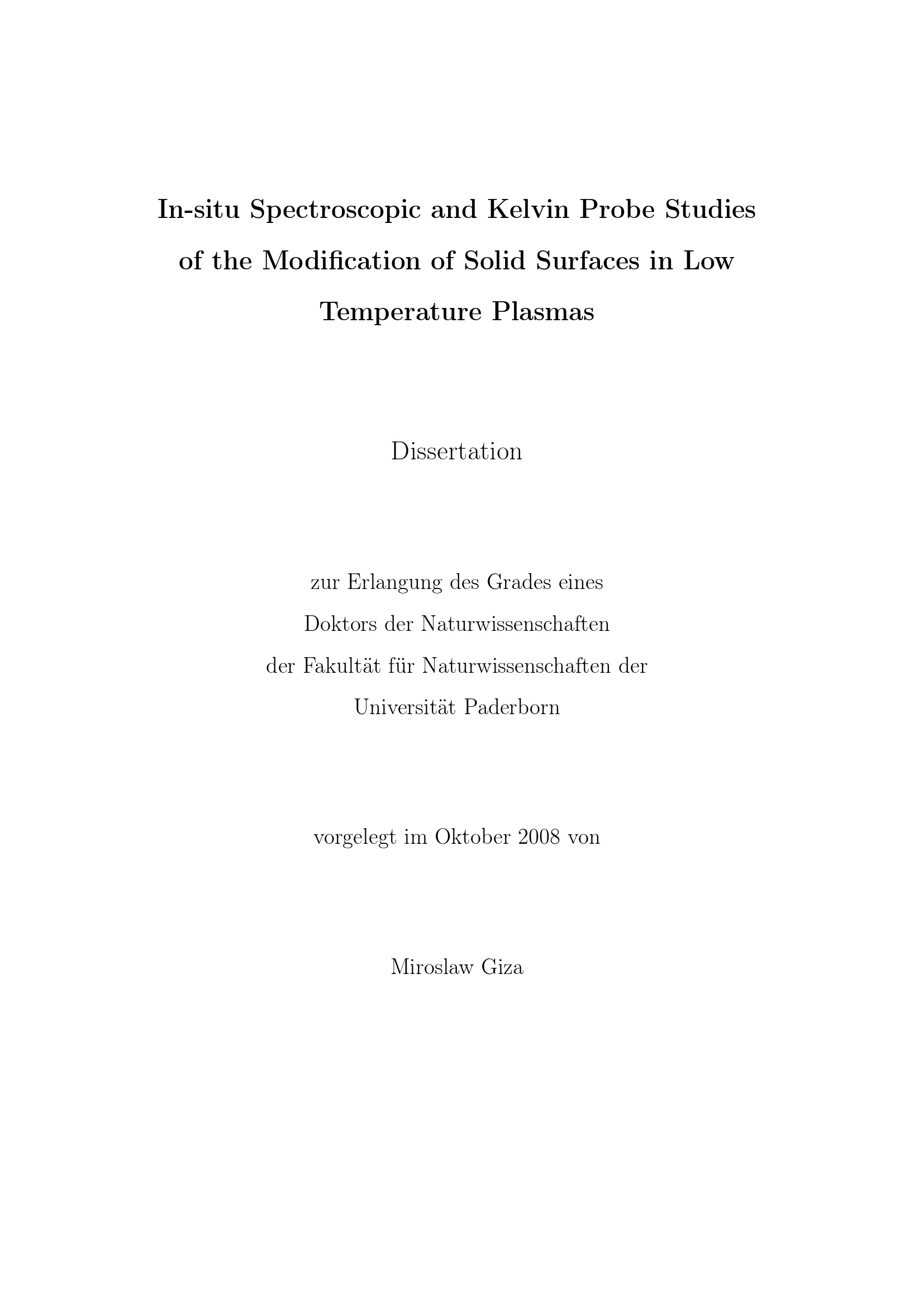 In-situ spectroscopic and Kelvin probe studies of the modification of solid surfaces in low temperature plasmas / Miroslaw Giza