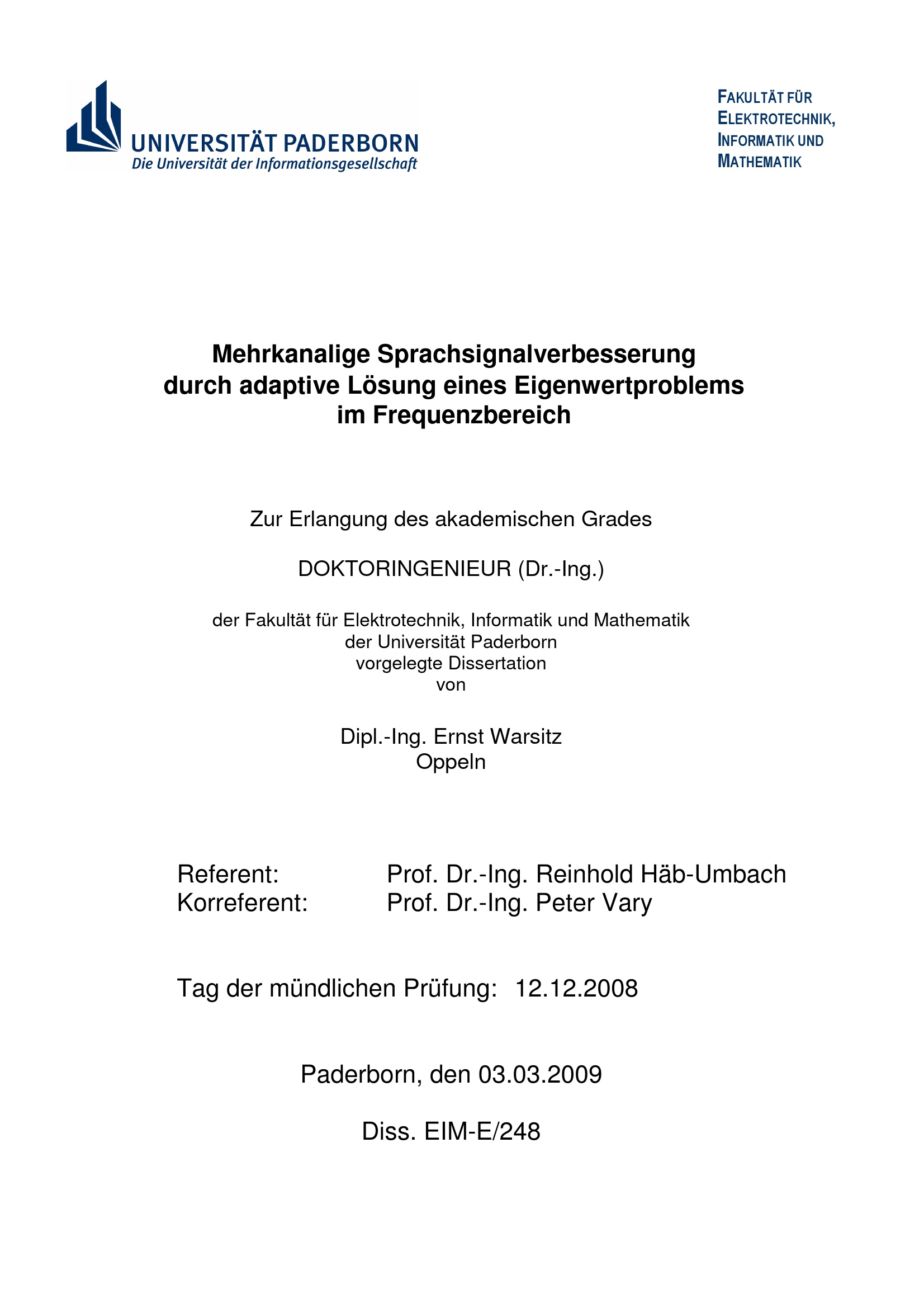 Mehrkanalige Sprachsignalverbesserung durch adaptive Lösung eines Eigenwertproblems im Frequenzbereich / Ernst Warsitz