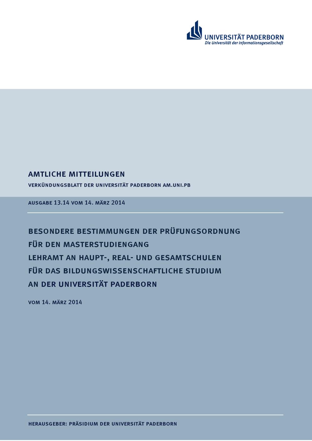 Besondere Bestimmungen der Prüfungsordnung für den Masterstudiengang Lehramt an Haupt-, Real- und Gesamtschulen für das bildungswissenschaftliche Studium an der Universität Paderborn : vom 14. März 2014